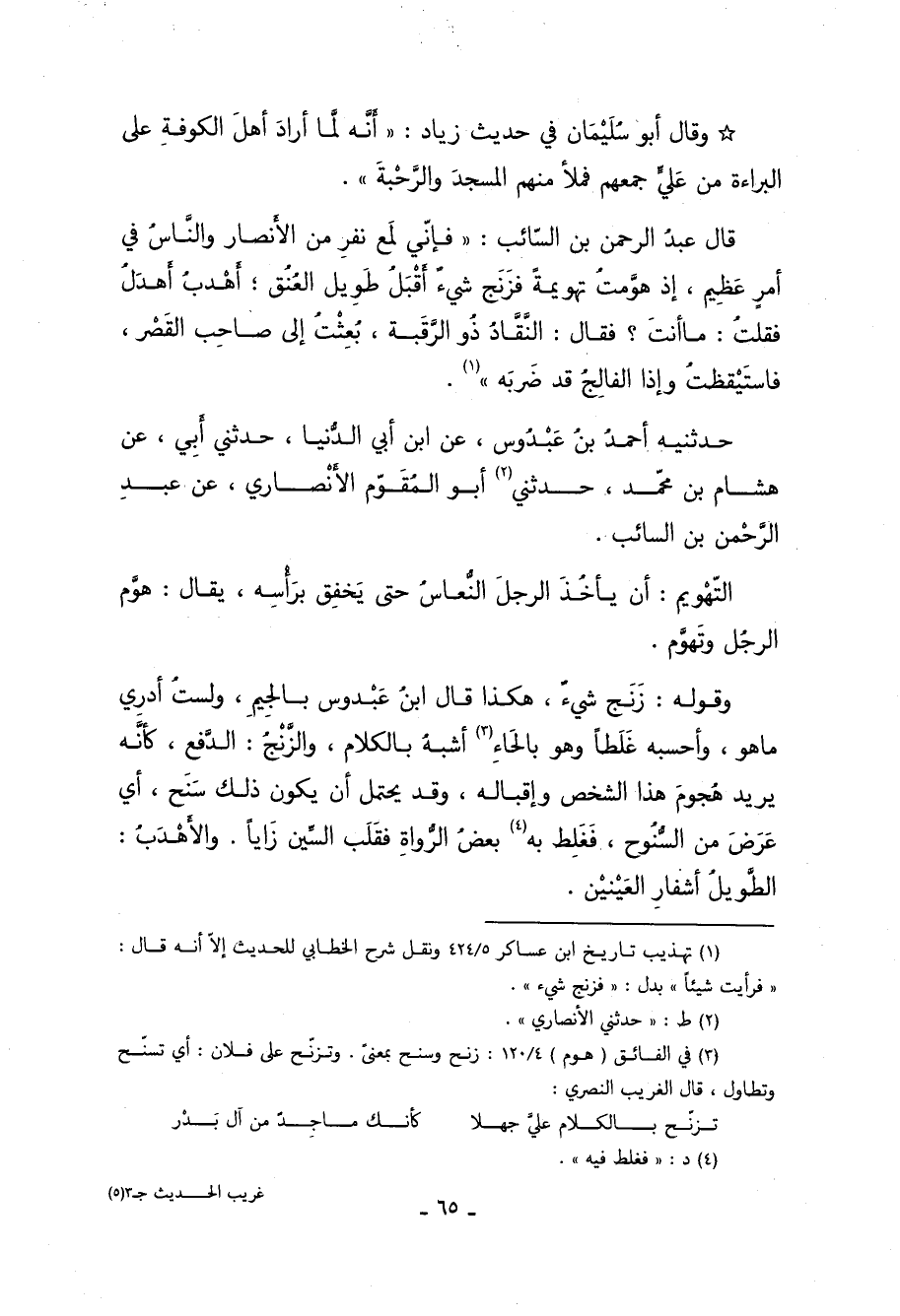1 تهذيب تاريخ ابن عساكر: 424/ 5, ونقل شرح الخطابي للحديث إلا أنه قال: "فرأيت شيئاً" بدل: "فزنج شيء".