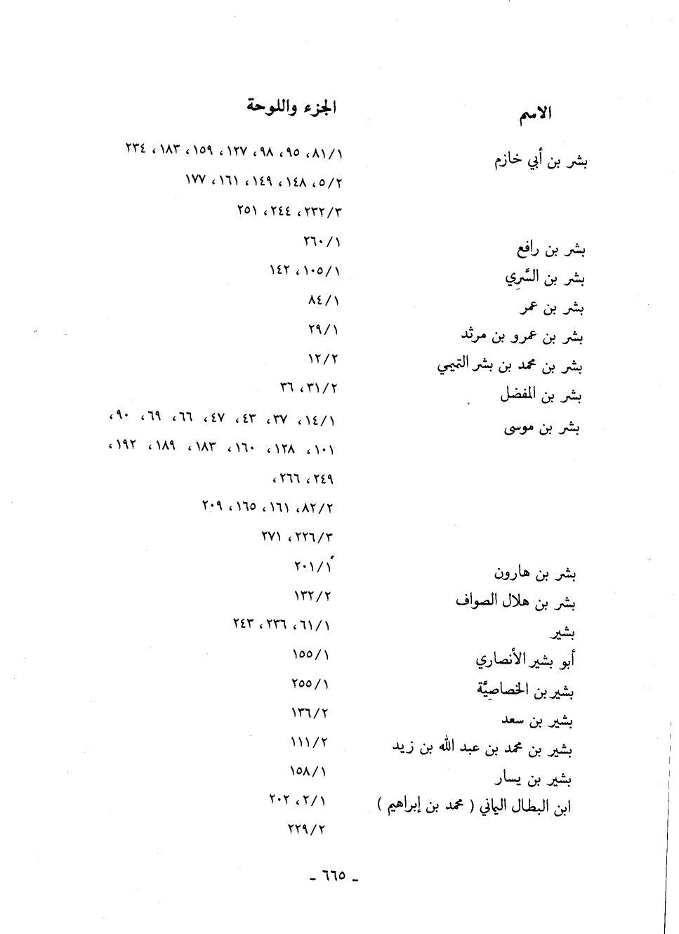 بشر بن موسى 14/ 1، 37، 43، 47، 66، 69، 90، 101، 128، 160، 183، 189، 192، 49، 266، 82/ 2، 161، 165، 209 226/ 3، 271 بشر بن هارون 201/ 1