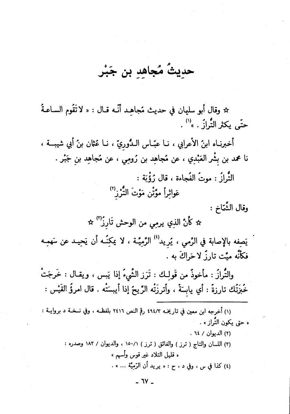 حديث مجاهد أنه قال: "لا تقوم الساعة حتى يكثر التُّراز"