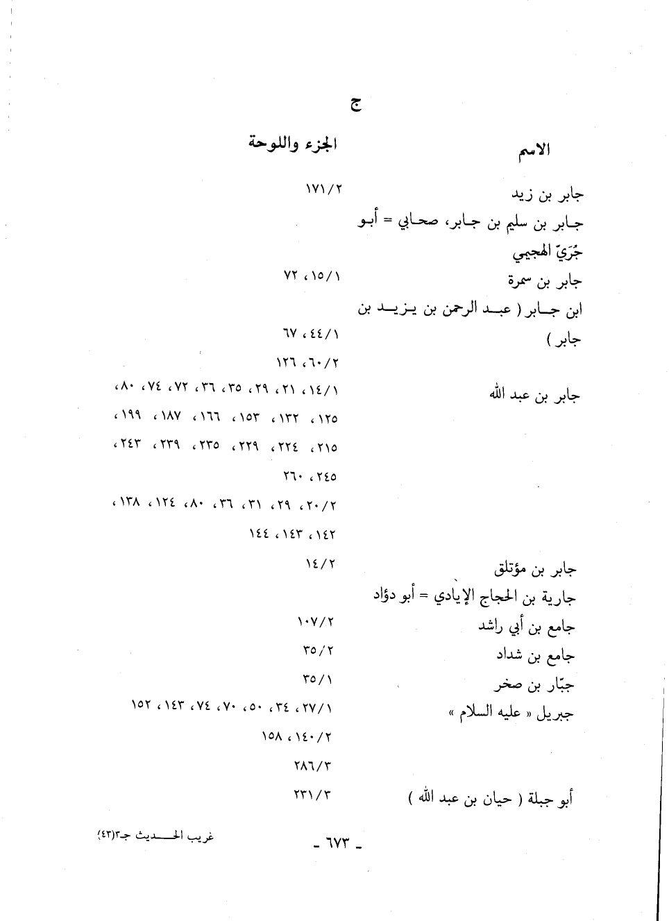 جابر بن عبد الله 14/ 1، 21، 29، 35، 36، 72، 74، 80، 125، 132، 153، 166، 187، 199، 215، 224، 229، 235، 239، 243، 245، 260 20/ 2، 29، 31، 36، 80، 124، 138، 142، 143، 144