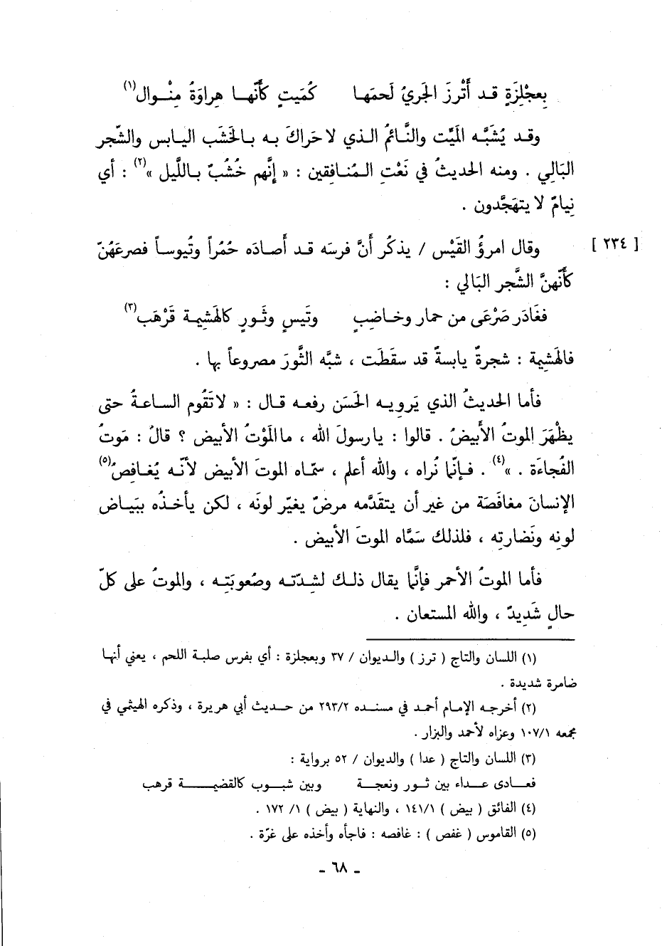 فأما الحديث الذي يرويه الحسن رفعه قال: "لا تقوم الساعة حتى يظهر الموت الأبيض", قَالُوا: يَا رَسُولَ اللَّهِ، مَا الموت الأبيض؟ قال: "موت الفجاءة" 4.