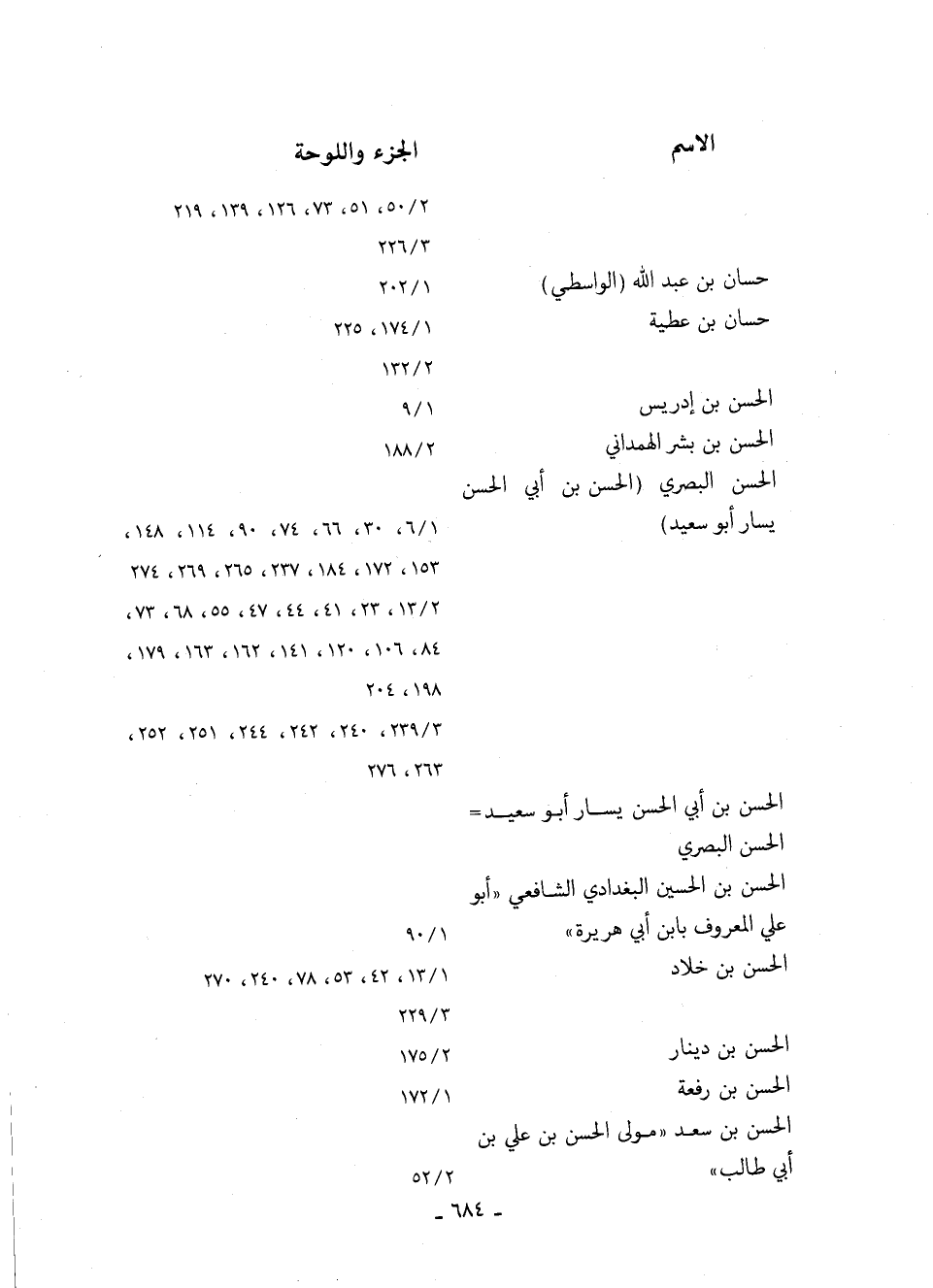 الحسن البصري "الحسن بن أبي الحسن يسار أبو سعيد" 6/ 1، 30، 66، 74، 90، 114، 148، 153، 172، 184، 237، 265، 269، 274 13/ 2، 23، 41، 44، 47، 55، 68، 73، 84، 106، 120، 141، 162، 163، 179، 198، 204 239/ 3، 240، 242، 244، 251، 252، 263، 276