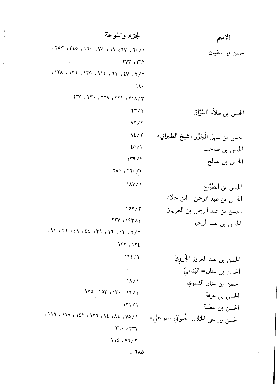 الحسن بن سفيان 60/ 1، 67، 68، 75، 160، 245، 253، 262، 273 2/ 2، 47، 61، 114، 125، 126، 128، 180 218/ 3، 221، 228، 230، 235