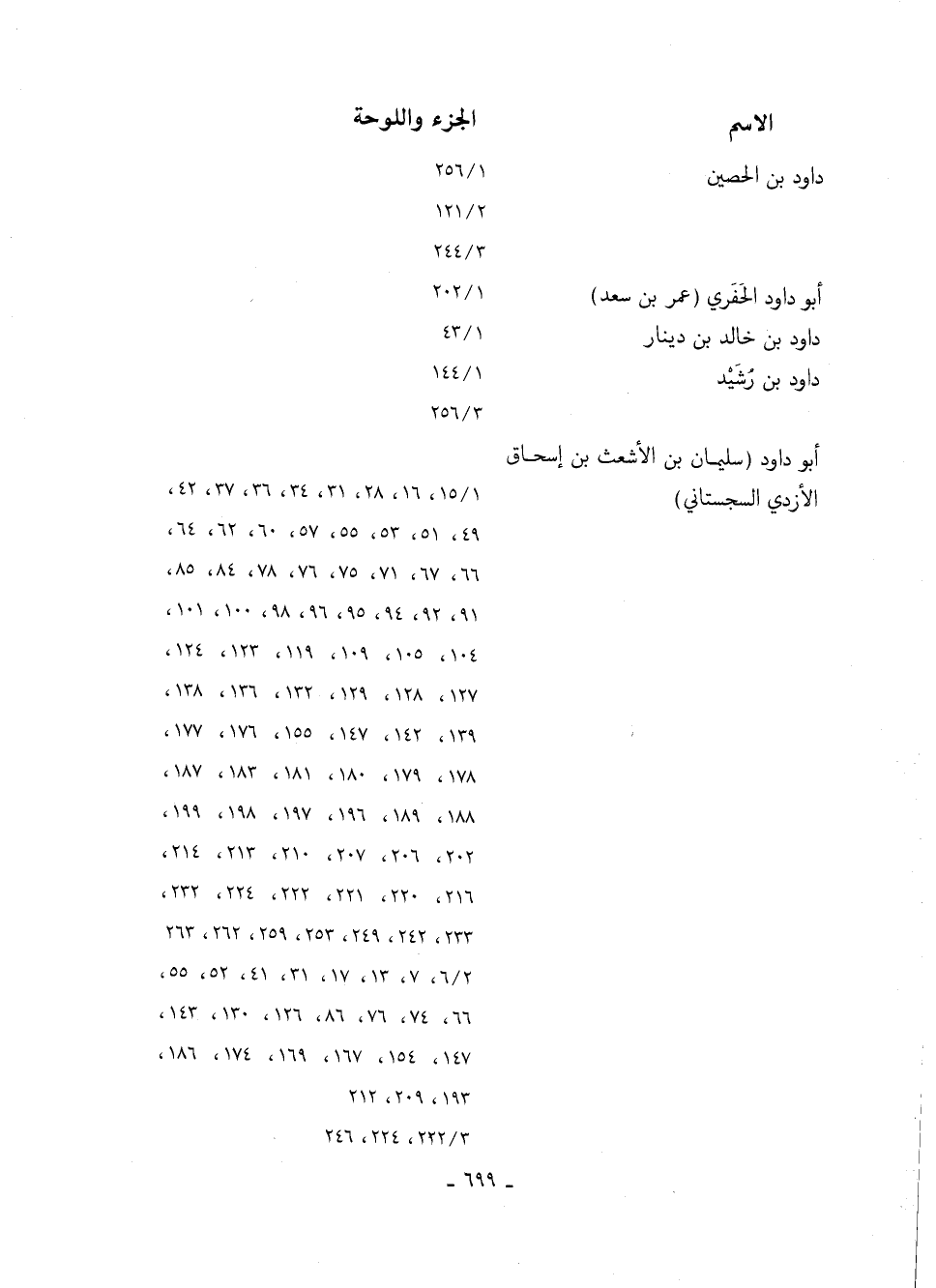 أَبُو دَاوُدَ "سُليْمَانُ بْنُ الأشْعَثِ بن إسحاق الأزدي السجستاني" 15/ 1، 16، 28، 31، 34، 36، 37، 42، 49، 51،53، 55، 57، 60، 62، 64، 66، 67، 71، 75، 76، 78، 84، 85، 91، 92، 94، 95، 96،98، 100، 101، 104، 105، 109، 119، 123، 124، 127، 128، 129، 132، 136، 138، 139، 142، 147، 155، 176، 177، 178، 179، 180، 181، 183، 187، 188، 189، 196، 197، 198، 199، 202، 206، 207، 210، 213، 214، 216، 220، 221، 222، 224، 232، 233، 242، 249، 253، 259، 262، 263 6/ 2، 7، 13، 17، 31، 41، 52، 55، 66، 74، 76، 86، 126، 130، 143، 147، 154، 167، 169، 174، 186، 193، 209، 212 222/ 3، 224، 246