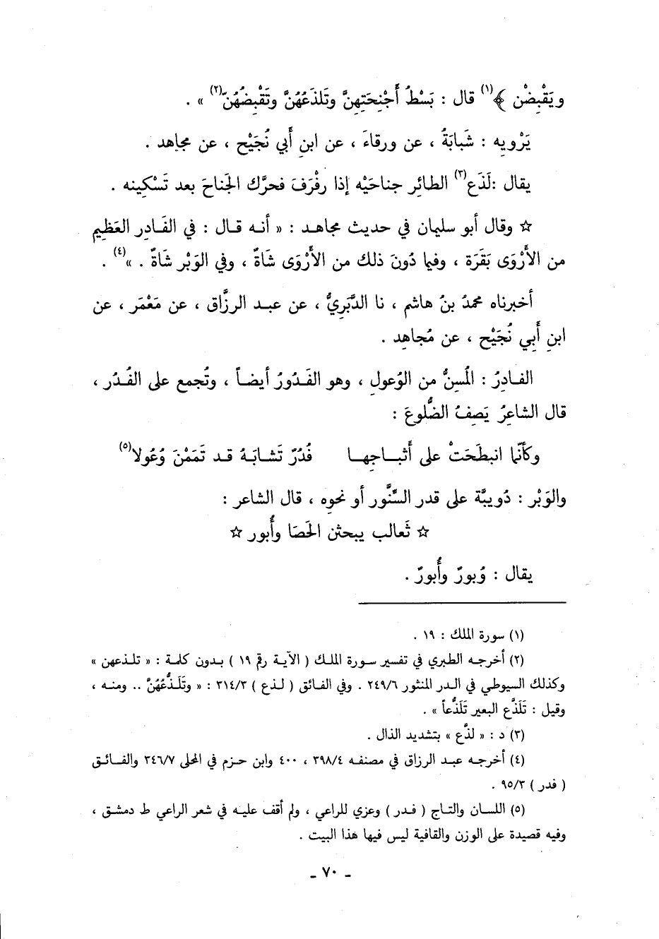 *وَقَالَ أَبُو سُلَيْمَانَ فِي حَدِيثِ مجاهد في قوله: {صَافَّاتٍ وَيَقْبِضْنَ} 1, قال: "بَسْطُ أجنحتهن, وتَلَذُّعُهُنَّ وتَقَبُّضُهُنَّ 2".