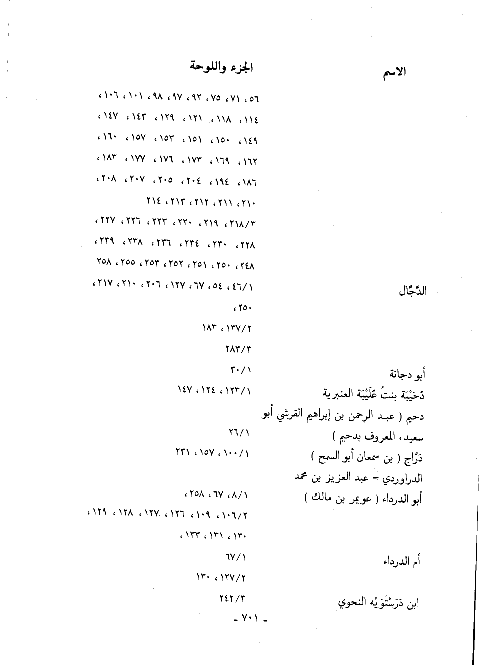 أبو الدرداء "عويمر بن مالك" 8/ 1، 67، 258، 106/ 2، 109، 126، 127، 128، 129، 130، 131، 133،