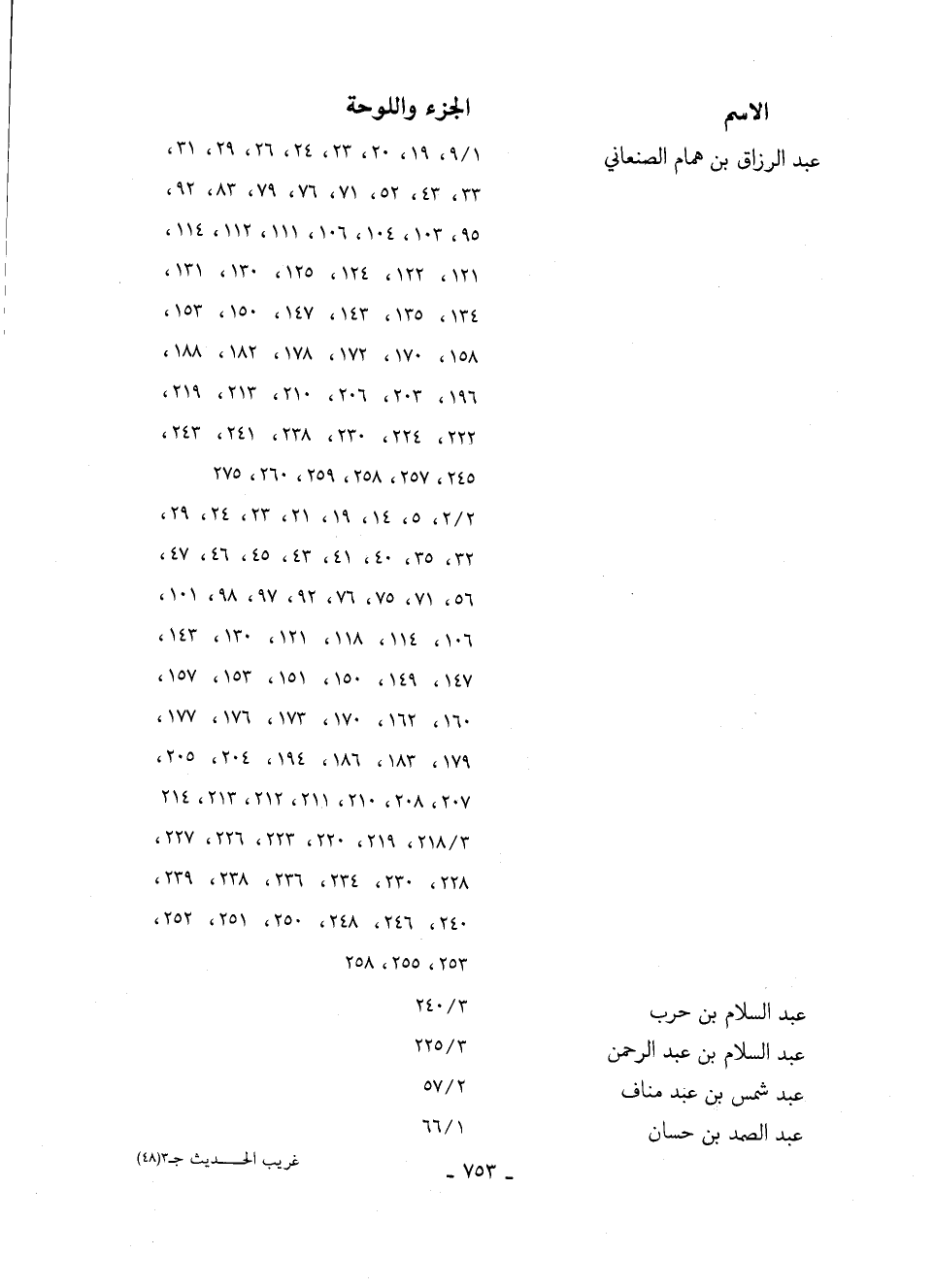 عبد الرزاق بن همام الصنعاني 9/ 1، 19، 20، 23، 24، 26، 29، 31، 33، 43، 52، 71، 76، 79، 83، 92، 95، 103، 104، 106، 111، 112، 114، 121، 122، 124، 124، 125، 130، 131، 134، 135، 143، 147، 150، 153، 158، 170، 172، 178، 182، 188، 196، 203، 206، 210، 213، 219، 222، 224، 230، 238، 241، 243، 245، 257، 258، 259، 260، 275 2/ 2، 5، 14، 19، 21، 23،24، 29، 32، 35، 40، 41، 43، 45، 46، 47، 56، 71، 75، 76، 92، 97، 98، 101، 106، 114، 118، 121، 130، 143، 147، 149، 150، 151، 153، 157، 160، 162، 170، 173، 176، 177، 179، 183، 186، 194، 204، 205، 207، 208، 210، 211، 212، 213، 214 218/ 3، 219، 220، 223، 226، 227، 228، 230، 234، 236، 238، 239، 240، 246، 248، 250، 251، 252، 253، 255، 258