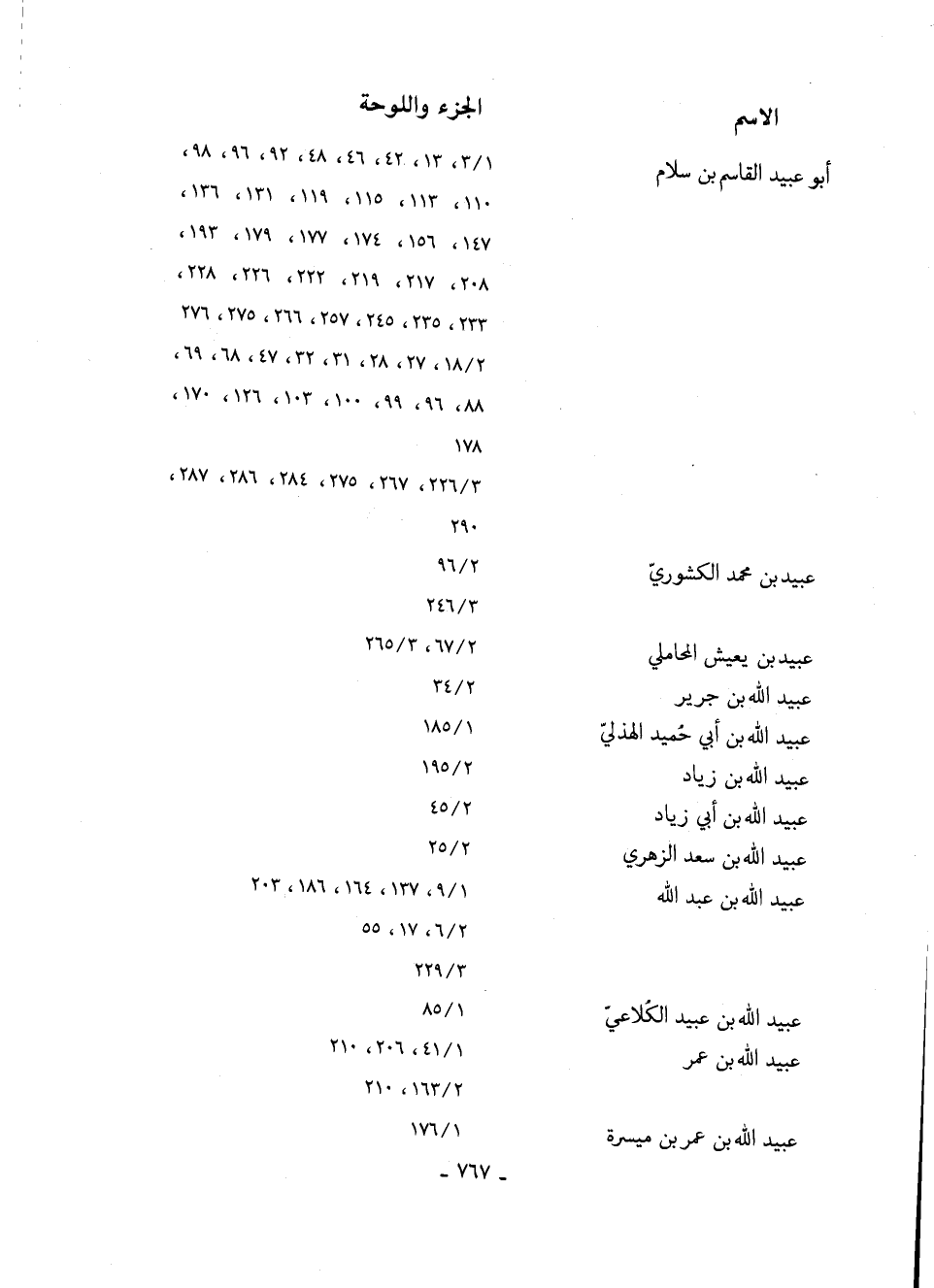 أبو عبيد القاسم بن سلام 3/ 1، 13، 42، 46، 48، 92، 96، 98، 110، 113، 115، 119، 131، 136، 147، 156، 174، 177، 179، 193، 208، 217، 219، 222، 226، 228، 233، 235، 245، 257، 266، 275، 276 18/ 2، 27، 28، 31، 32، 47، 68، 69، 88، 96، 99، 100، 103، 126، 170، 178 226/ 3، 267، 275، 284، 286، 287، 290