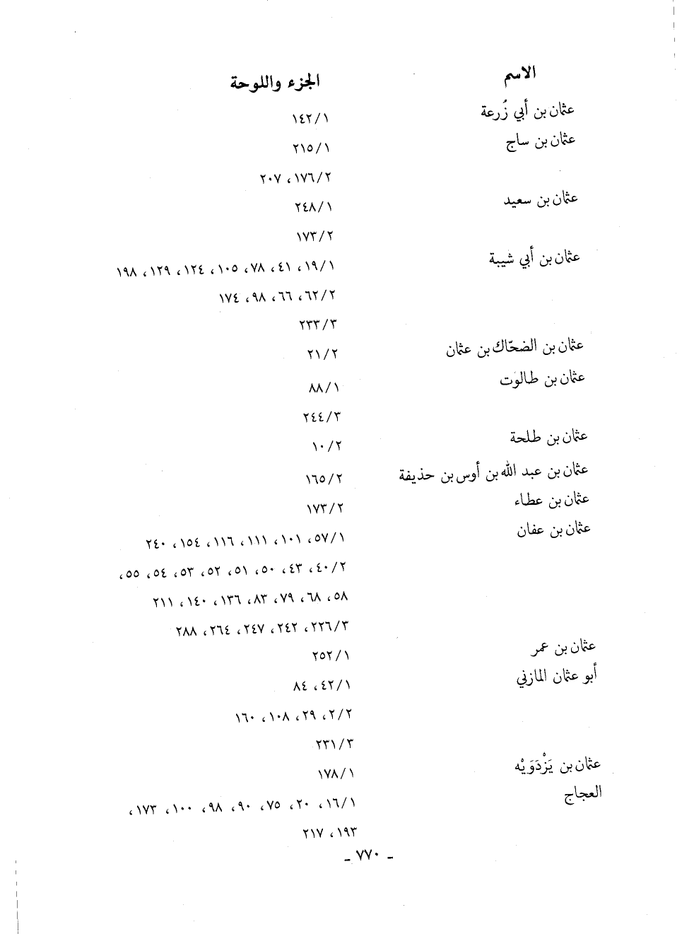 عثمان بن أبي شيبة 19/ 1، 41، 78، 105، 124، 129، 198 62/ 2، 66، 98، 174 233/ 3