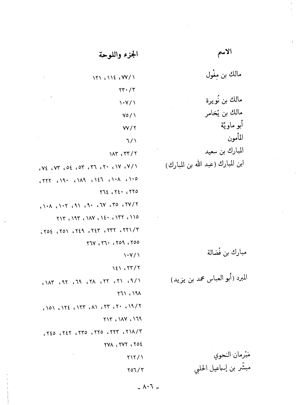ابن المبارك "عبد الله بن المبارك" 7/ 1، 17، 20، 36، 53، 54، 73، 74، 105، 108، 146، 189، 190، 222، 225، 240، 264 27/ 2، 35، 67، 90، 91، 102، 108، 115، 132، 140، 187، 193، 213 221/ 3، 232، 243، 249، 251، 254، 255، 259، 260، 267