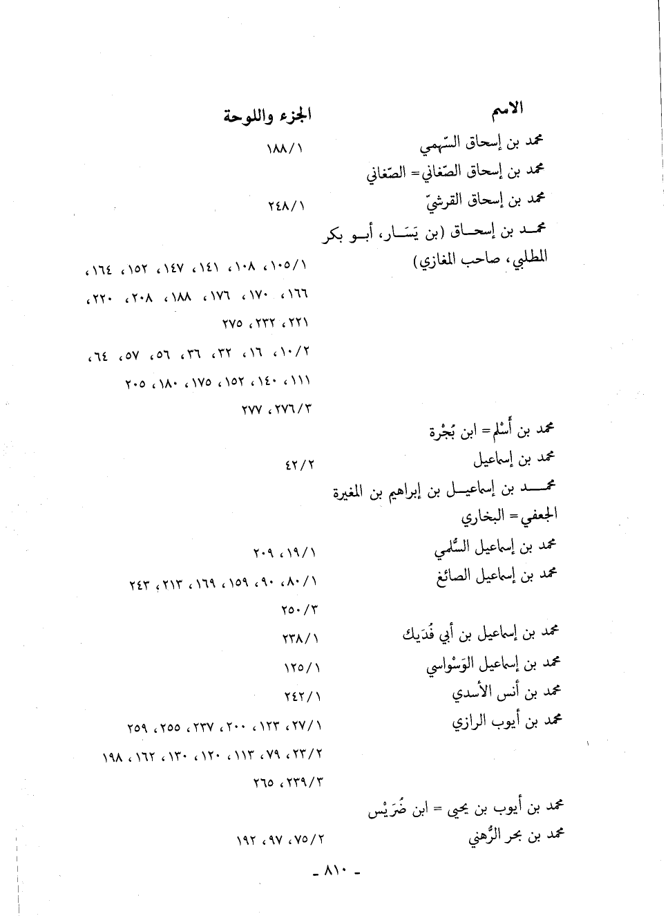 مُحَمَّدِ بْنِ إِسْحَاقَ "بْنِ يَسَارٍ، أبو بكر المطلبي، صاحب المغازي" 105/ 1، 108، 141، 147، 152، 164، 166، 170، 176، 188، 208، 220، 221، 232، 275 10/ 2، 16، 32، 36، 56، 57، 64، 111، 140، 152، 175، 180، 205 276/ 3، 277