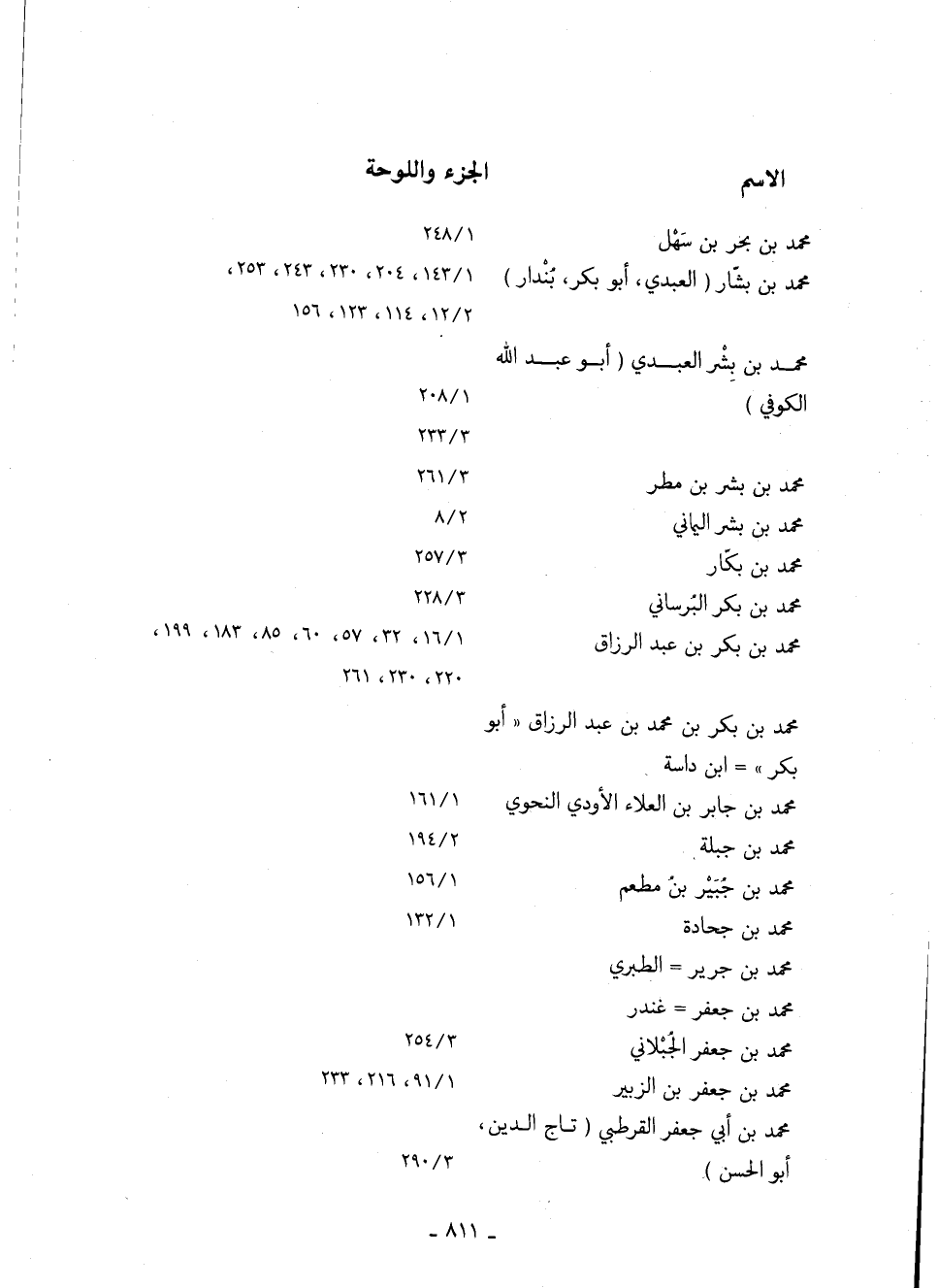 محمد بن بشار "العبدي، أبو بكر، بندار" 143/ 1، 204، 230، 243، 253، 12/ 2، 114، 123، 156