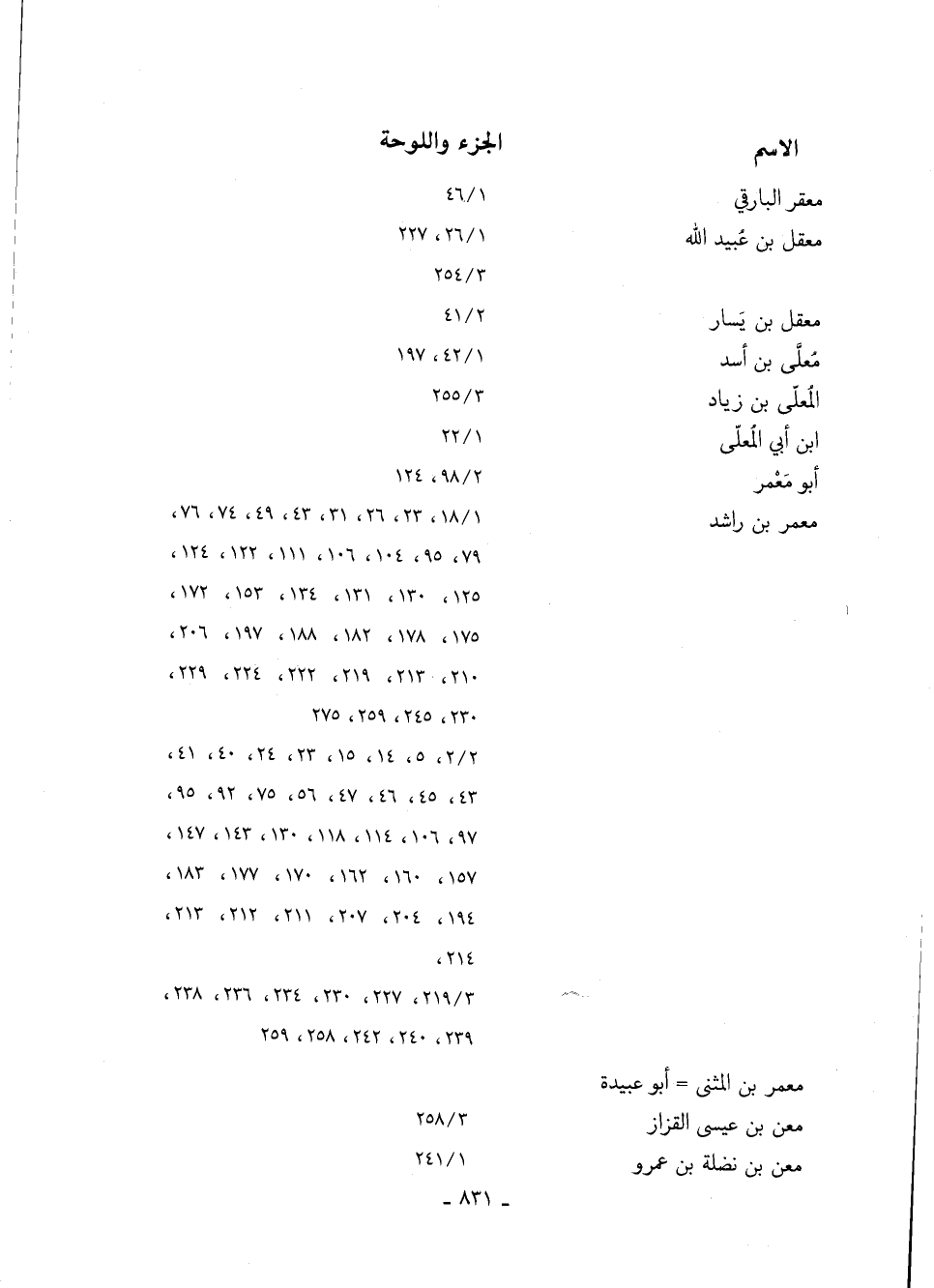 معمر بن راشد 18/ 1، 23، 26، 31، 43، 49، 74، 76، 79، 95، 104، 106، 111، 122، 124، 125، 130، 131، 134، 153، 172، 175، 178، 182، 188، 197، 206، 210، 213، 219، 222، 224، 229، 230، 245، 259، 275 2/ 2، 5، 14، 15، 23، 24، 40، 41، 43، 45، 46، 47، 56، 75، 92، 95، 97، 106، 114، 118، 130، 143، 147، 157، 160، 162، 170، 177، 183، 194، 204، 207، 211، 212، 213، 214، 219/ 3، 227، 230، 234، 236، 238، 239، 240، 242، 258، 259
