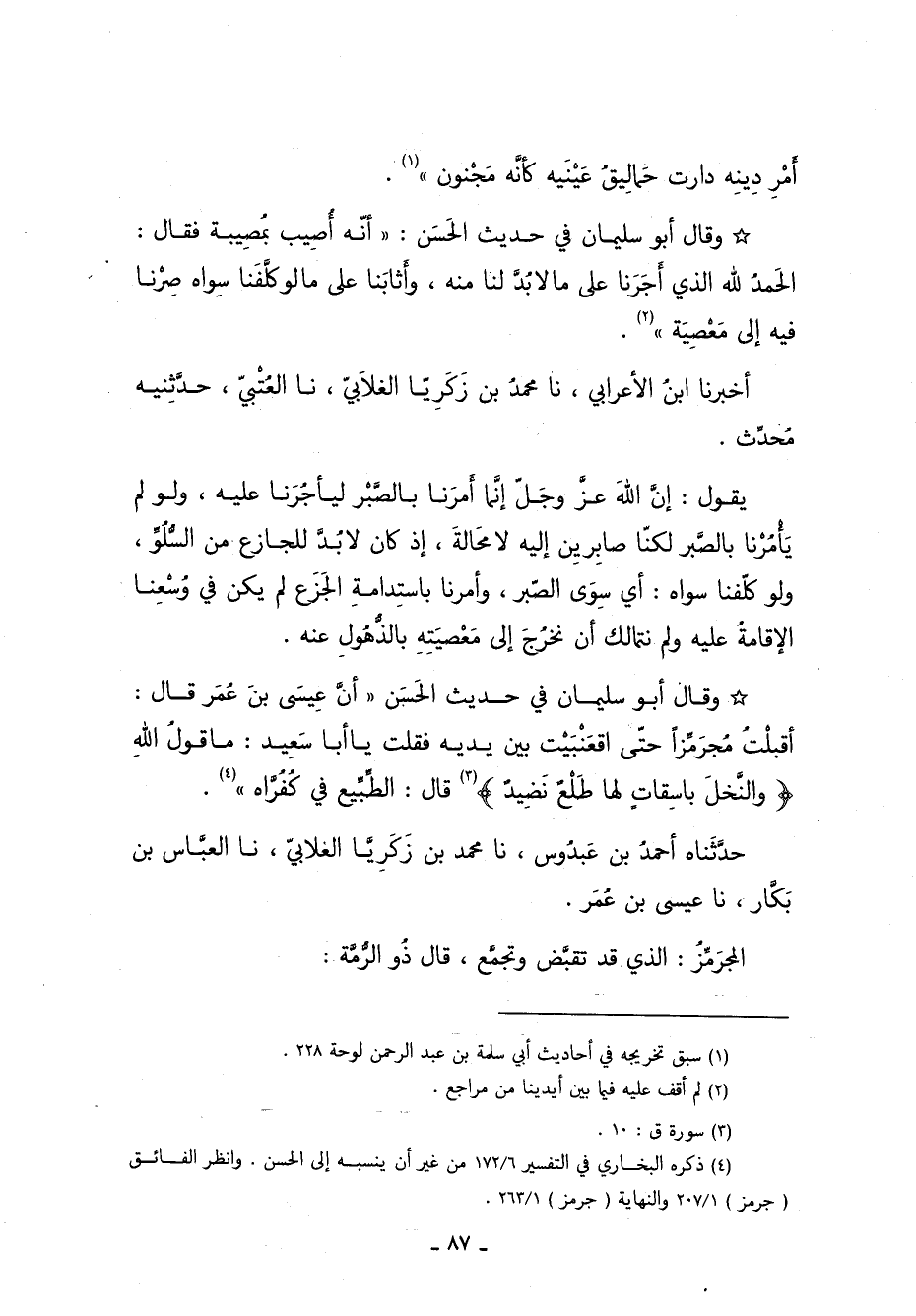 *وَقَالَ أَبُو سُلَيْمَانَ فِي حَدِيثِ الحسن: "أنه أصيب بمصيبة فقال: الحمد لله الذي أَجَرَنَا على ما لا بد لنا منه، وأثابنا على ما لو كَلَّفَنَا سواه صرنا فيه إلى معصية"1.