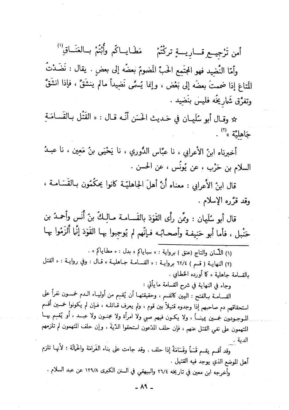 1 النهاية: "قسم": 62/ 4, برواية: "القسامة جاهلية", قال: وفي رواية: "القتل بالقسامة جاهلية", كما أورده الخطابي.