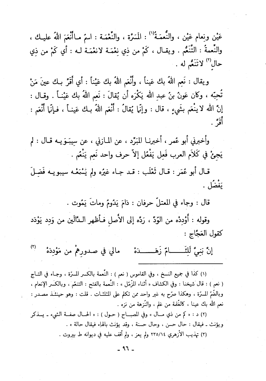 1 كذا في جميع النسخ، وفي: القاموس: "نعم": النِّعْمَة بالكسر المسرة، وجاء في التاج: "نعم": قال شيخنا: وفي الكشاف "أثناء المزمل": النَّعْمَة بالفتح: التنعم، وبالكسر الإنعام، وبالضم المسرة، وهكذا صرح به غير واحد ممن تكلم على المثلثات, قلت: وحينذ مصدر: نعم الله بك عينا، كالغُلمة من "غلم"، والنُّزهة من "نزه".