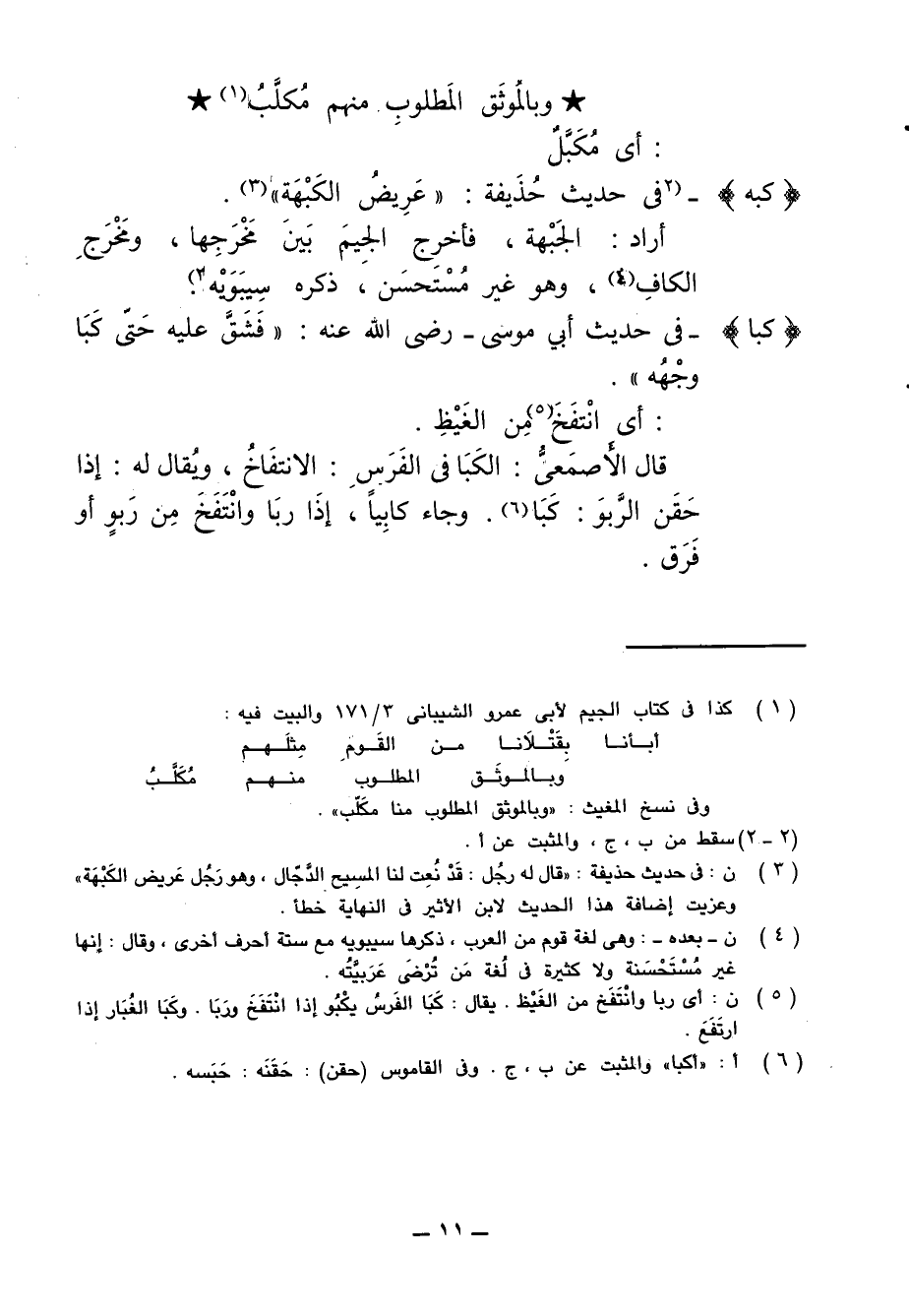 (¬3) ن: في حديث حذيفة: "قال له رجُل: قَدْ نُعِت لنا المسِيح الدَّجّال، وهو رَجلٍ عَريض الكَبْهَة" وعزيت إضافة هذا الحديث لابن الأثير في النهاية خطأ.
