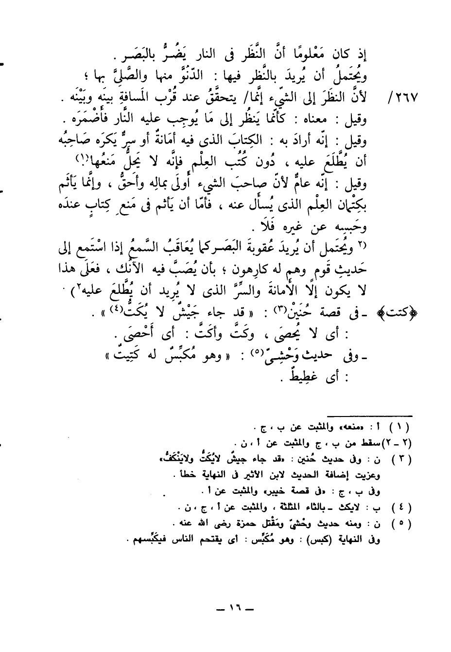 (2 ويُحتَمل أن يُريدَ عُقوبةَ البَصَر كما يُعَاقَبُ السَّمعُ إذا اسْتَمِع إلى حَديثِ قَومٍ وهم له كارِهون؛ بأن يُصَبَّ فيه الآنُك، فعَلى هذا لا يكون إلّا الأمانةَ والسِّرَّ الذي لا يُرِيد أن يُطَّلعَ عليه 2)