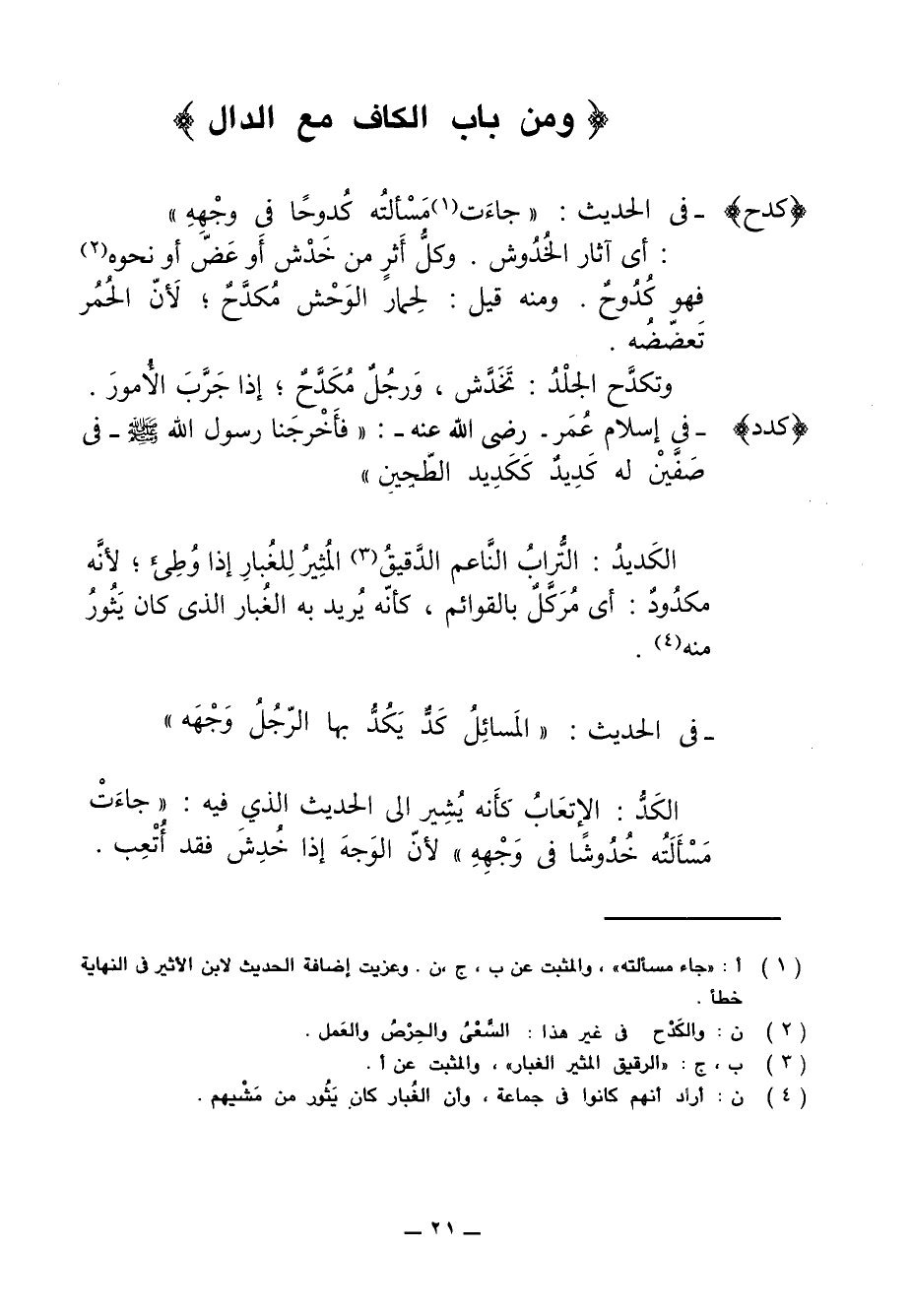 (كدد) - في إسلام عُمَر - رضي الله عنه -: "فأخْرجَنا رسول الله - صَلَّى الله عليه وسلم - في صَفَّيْن له كَدِيدٌ كَكَدِيد الطّحين"