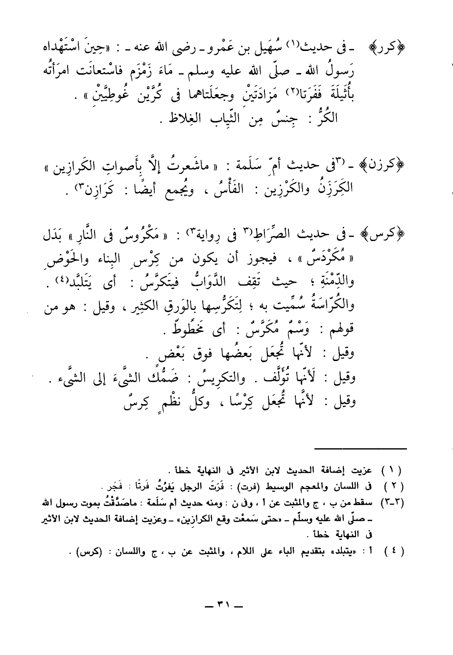 (كرس) - في حديث الصِّرَاطِ (3 في رِواية 3): "مَكْرُوسٌ في النَّارِ" بَدَل "مُكَرْدَسٌ"، فيجوز أن يكون من كِرْسِ البِناء والحَوْضِ والدِّمْنَةِ؛ حيث تَقِف الدَّوَابُّ فيتَكرَّسُ: أي يَتَلبَّد (¬4). والكُرّاسَةُ سُمَّيت به؛ لِتَكَرُّسِها بالوَرقِ الكثِير، وقيل: هو من قولهم: وَسْمٌ مُكَرَّسٌ: أي مَخطُوطٌ.