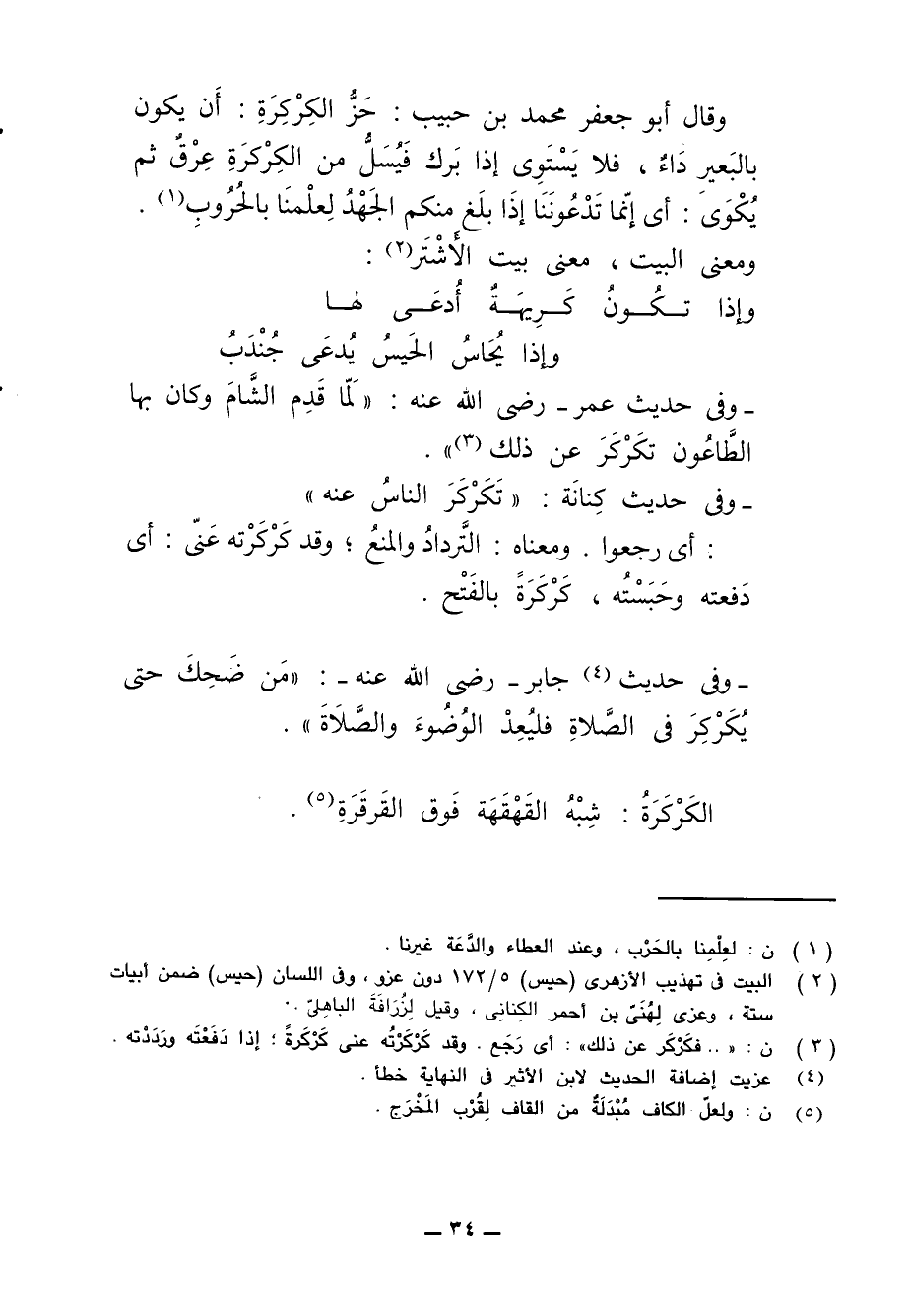 وقال أبو جعفر محمد بن حبيب: حَزُّ الكِرْكِرَةِ: أَن يكون بالبَعير دَاءٌ، فلا يَسْتَوِى إذا بَرك فَيُسَلُّ من الكِرْكرَةِ عِرْقٌ ثم يُكْوَىَ: أي إنّما تَدْعُونَنَا إذَا بلَغ منكم الجَهْدُ لِعلْمنَا بالحُرُوبِ (¬1).