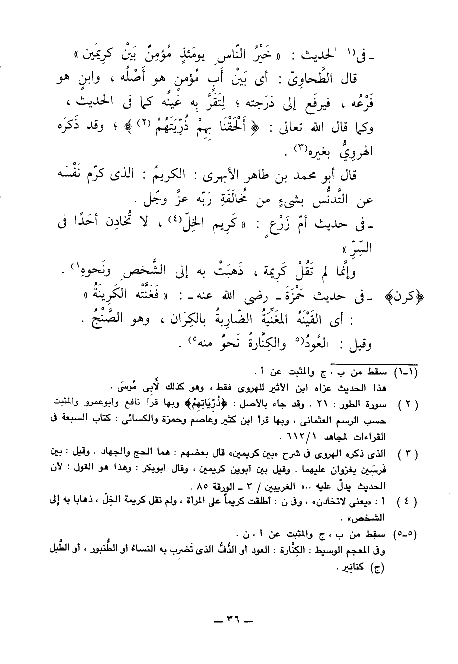 (¬3) الذي ذكره الهروى في شرح "بين كريمين" قال بعضهم: هما الحج والجهاد. وقيل: بين فَرسَين يغزوان عليهما. وقيل بين أبوين كريمين، وقال أبو بكر: وهذا هو القول؛ لأن الحديث يدلّ عليه .. " الغريبين/ 3 - الورقة 85.