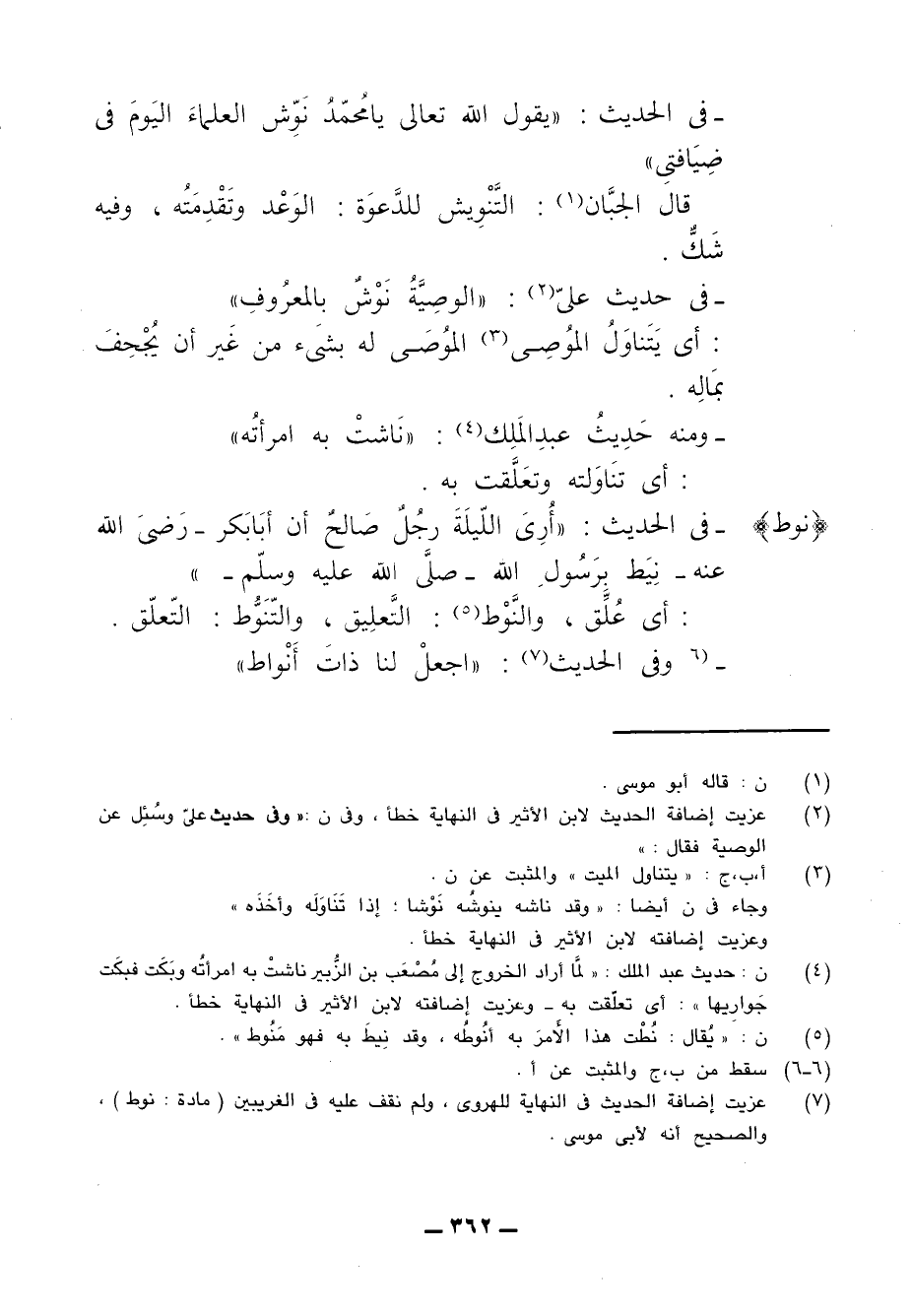 (¬7) عزيت إضافة الحديث في النهاية للهروى، ولم نقف عليه في الغريبين (مادة: نوط)، والصحيح أنه لأبى موسى.