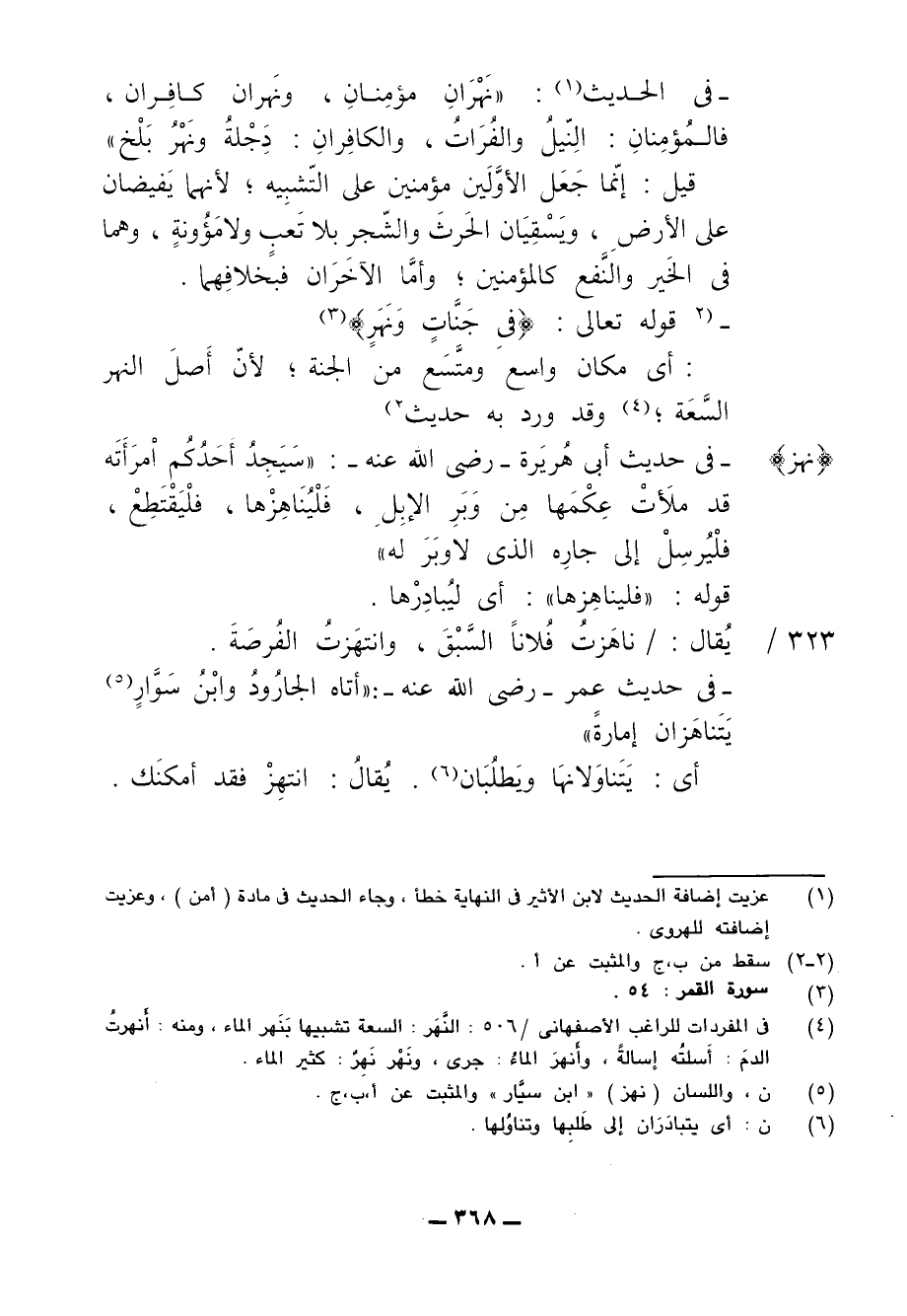 (¬4) في المفردات للراغب الأصفهانى/ 506: النَّهَر: السعة تشبيها بَنَهر الماء، ومنه: أَنهرتُ الدمَ: أَسلتُه إسالةً، وأنهرَ الماءُ: جرى، ونَهْر نَهِرٌ: كثير الماء.