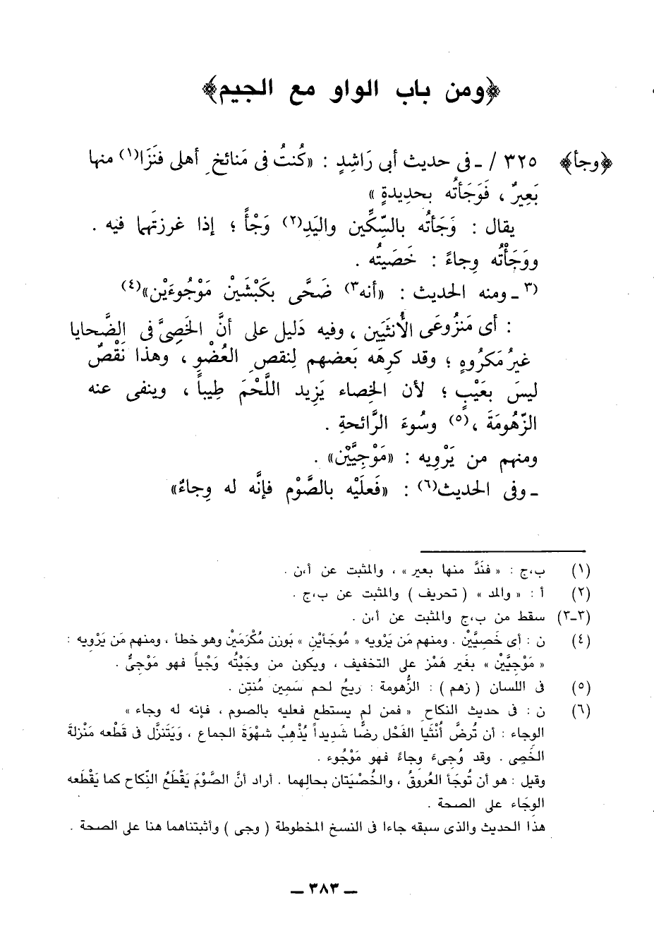 (¬4) ن: أي خَصِيَّيْن. ومنهم مَن يَرْويه "مُوجَأيْنِ" بَوزن مُكْرَمَيْن وهو خطأ، ومنهم مَن يَرْوِيه: "مَوْجيَّيْن" بغَير هَمْز على التخفيف، ويكون من وجَيْتُه وَجْياً فهو مَوْجِىٌّ.