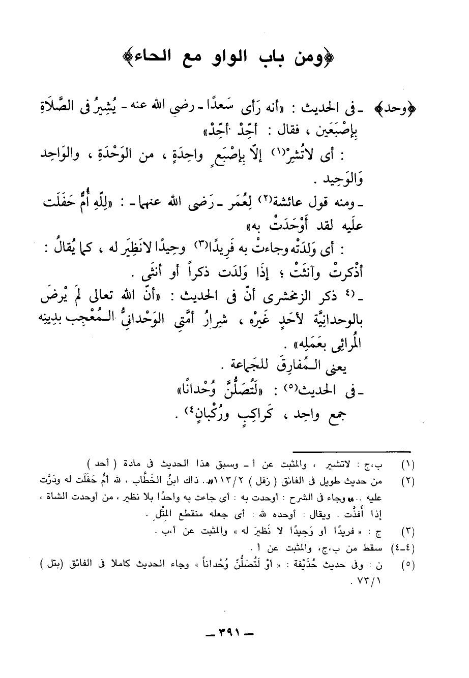 - (4 ذكر الزمخشري أنّ في الحديث: "أنّ الله تعالى لمَ يْرضَ بالوحدانِيَّة لأحَدٍ غَيرْه، شِرارُ أمَّتِى الوَحْدانِيُّ المُعْجِب بدِينِه المُرائِي بعَمَلِه".