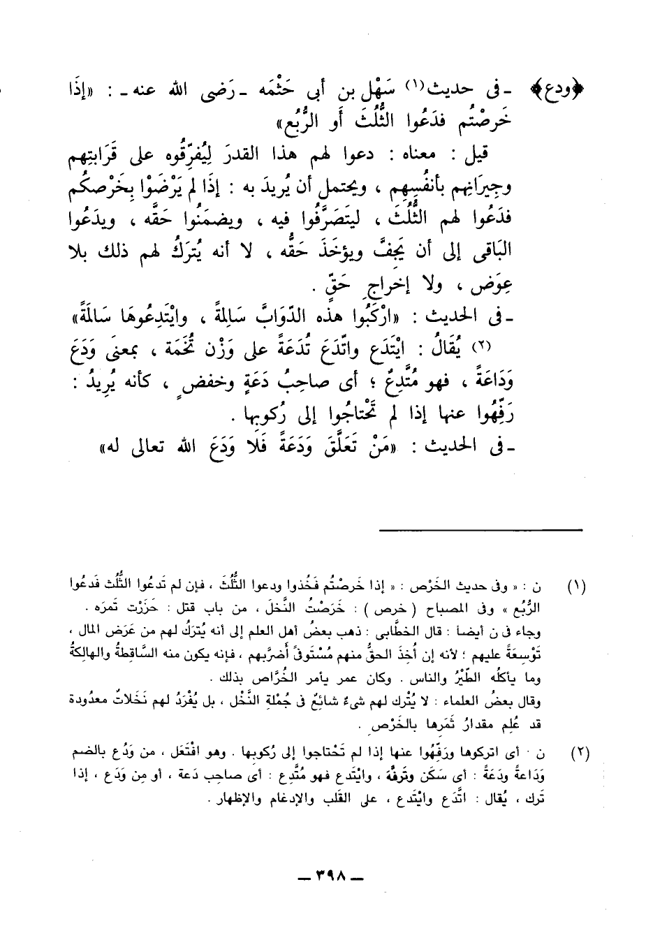 (¬1) ن: "وفي حديث الخَرْص: "إذا خَرصْتُم فَخُذوا ودعوا الثُّلُثَ، فإن لم تَدعُوا الثُّلُث فَدعُوا الرُّبُع" وفي المصباح (خرص): خَرَصْتُ النَّخلَ، من باب قتل: حَزَرْت تَمرَه.