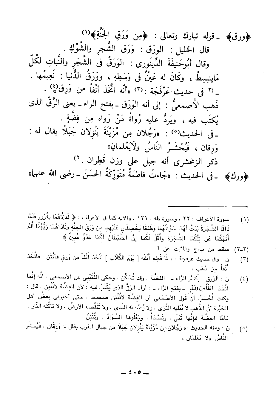 (ورق) - قوله تبارك وتعالى: {مِنْ وَرَقِ الْجَنَّةِ} (¬1)