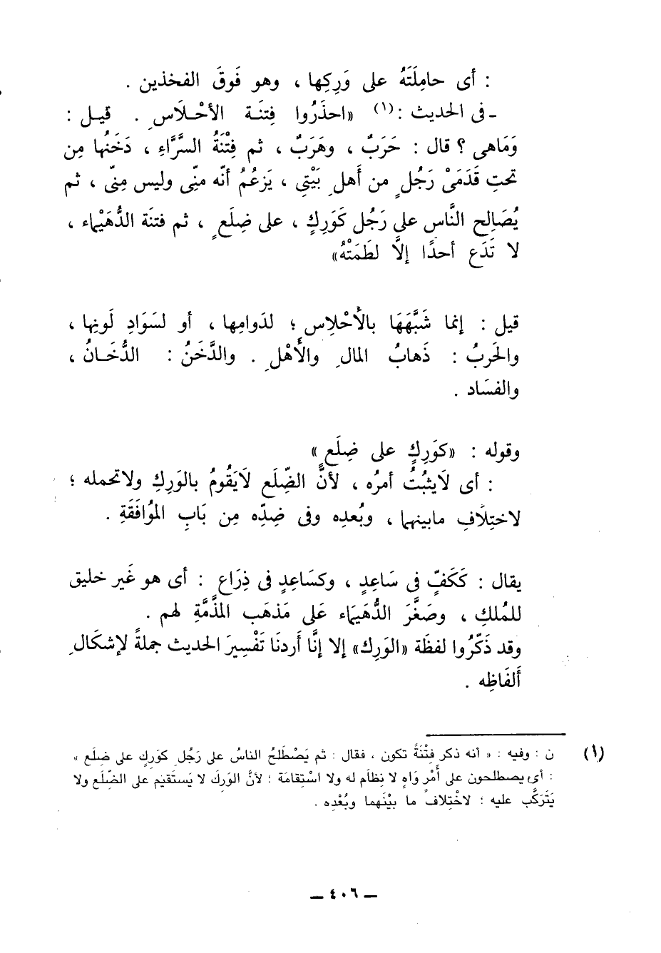 (¬1) ن: وفيه: "أنه ذكر فِتْنَةً تكون، فقال: ثم يَصْطَلحُ الناسُ على رَجُلِ كوَرِكٍ على ضِلَع"