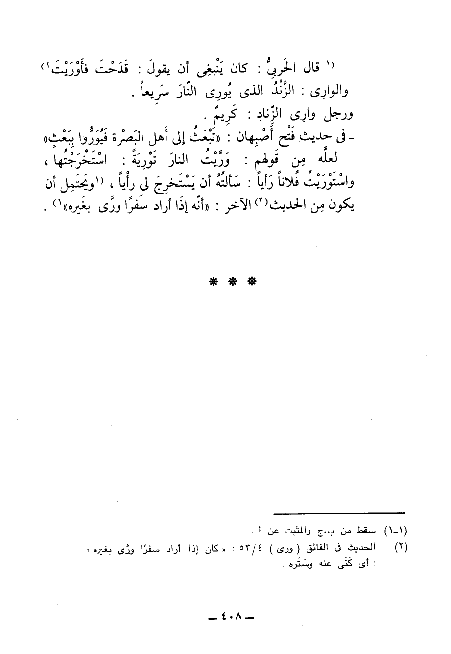 (1 قال الحَربِيُّ: كان يَنْبغِى أن يقولَ: قَدَحْتَ فأَوْرَيْتَ 1) والوارِى: الزَّنْدُ الذي يُورِى النّارَ سَرِيعاً.