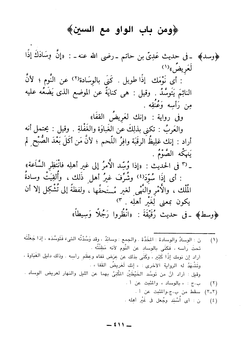 (وسد) - في حديث عَدِىّ بن حاتم - رضي الله عنه -: "إنَّ وِسَادَكَ إذًا لَعَرِيضٌ" (¬1)