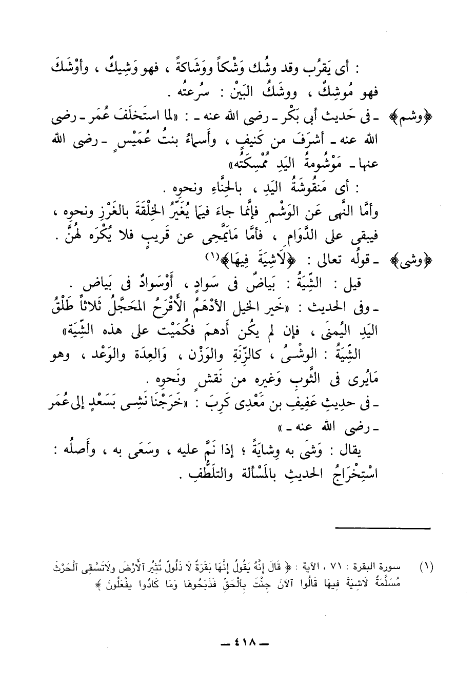 (وشى) - قولُه تعالى: {لَا شِيَةَ فِيهَا} (¬1)