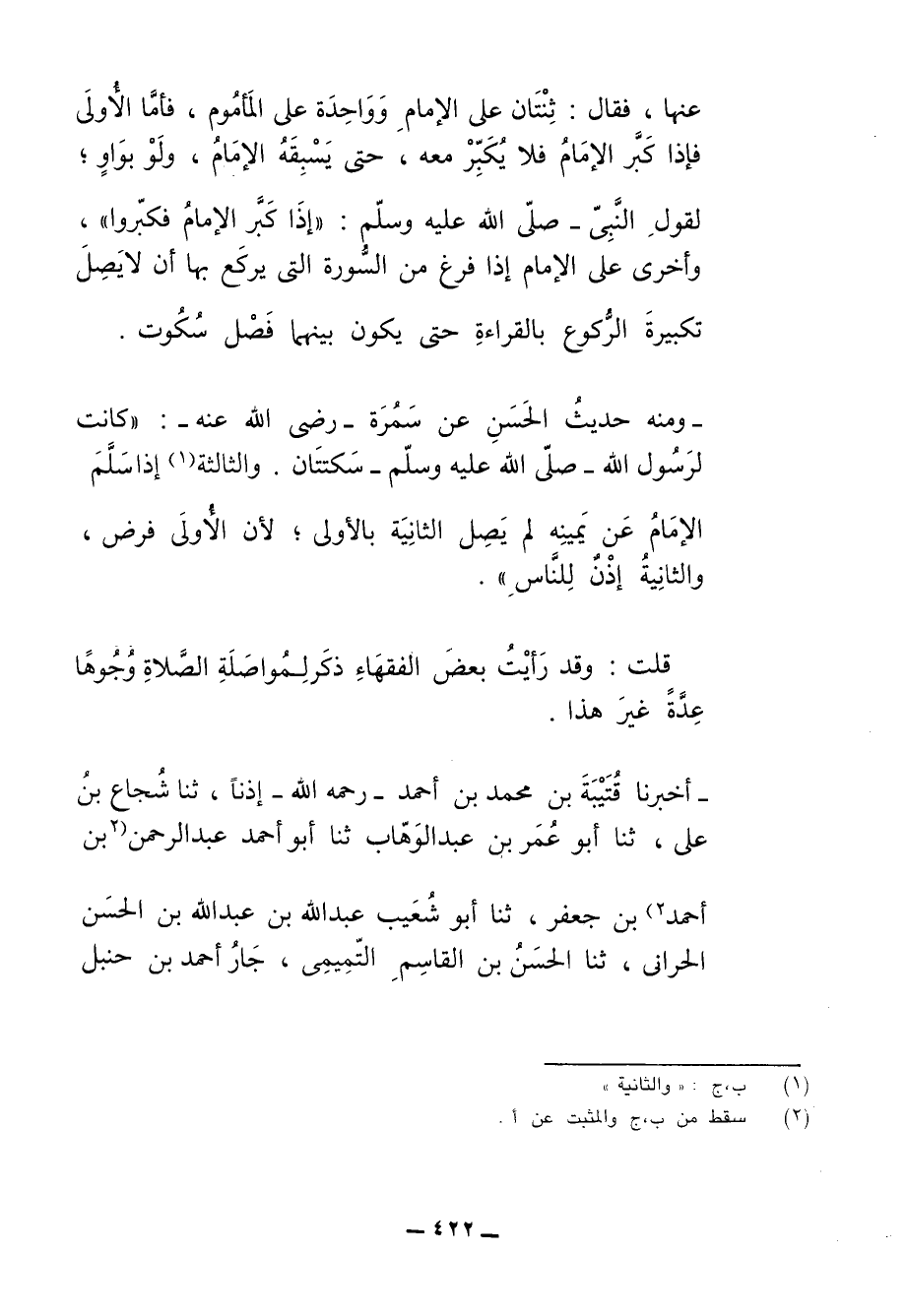 - ومنه حديثُ الحَسَنِ عن سَمُرَة - رضي الله عنه -: "كانت لرَسُول الله - صلّى الله عليه وسلّم - سَكتتَان. والثالثة (¬1) إذا سَلَّمَ الإمَامُ عَن يَمينِه لم يَصِل الثانِيَة بالأولى؛ لأن الأُولَى فرض، والثانِيةُ إذْنٌ لِلنَّاسِ".