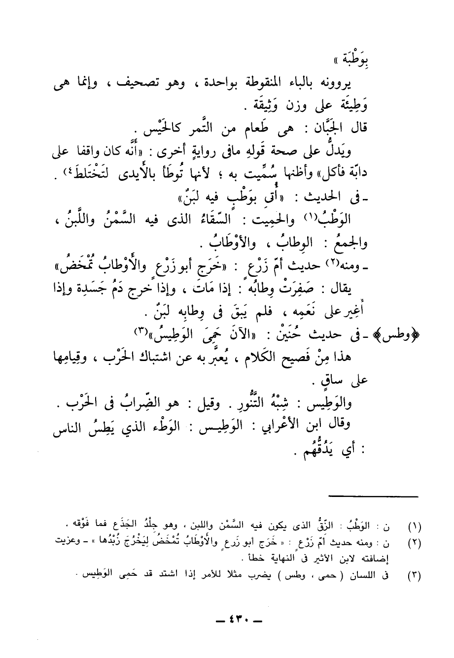 (¬2) ن: ومنه حديث أَمّ زَرْعٍ: "خَرَج أَبو زَرعٍ والأَوْطَابُ تُمْخَضُ لِيَخْرُجَ زُبْدُها" - وعزيت إضافته لابن الأثير في النهاية خطأ.