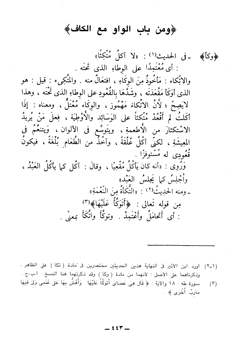 (¬1) أورد ابن الأثير في النهاية هذين الحديثين مختصرين في مادة (تكأ) على الظاهر، وذكرناهما على الأصل: لأنهما من مادة (وكأ) وقد ذكرتهما هنا النسخ: أ، ب، جـ.