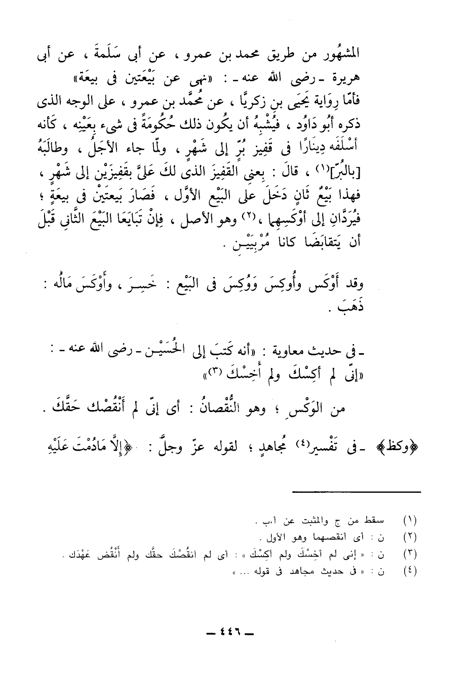 فأمّا رِوَاية يَحيَى بنِ زكريَّا، عن مُحمَّد بن عمرو، على الوجه الذي ذكره أبُو دَاوُد، فيُشْبِهُ أن يكُون ذلك حُكُومَةً في شىء بِعَيْنِه، كَأنه أسْلَفَه دِينَارًا في قَفِيز بُرٍّ إلى شَهْرٍ، ولمّا جاء الأجَلُ، وطالَبَهُ [بالبُرّ] (¬1)، قالَ: بِعنِى القَفِيزَ الذي لكَ عَلىَّ بقَفِيزَيْن إلى شَهْرٍ، فهذا بَيْعٌ ثَانٍ دَخَلَ على البَيْع الأوَّل، فَصَارَ بَيعتَيْن في بيعَةٍ؛ فيُرَدَّانِ إلى أوْكَسِهِما، (¬2) وهو الأصل، فِإنْ تَبَايَعَا البَيْعَ الثَّانىِ قَبْلَ أن يَتقابَضَا كانا مُرْبِيَيْنِ.