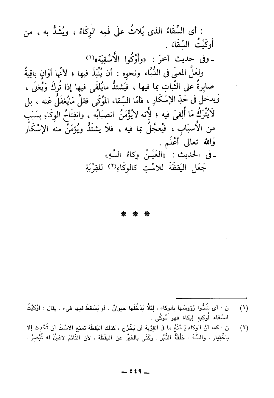 (¬2) ن: كما أنّ الوِكاء يَمْنَعُ ما في القِرْبة أن يَخْرُج، كذلك اليَقظَة تمنع الاسْتَ أن تُحْدِث إلا باخْتِيار. والسَّهُ: حَلْقَةُ الدُّبُر. وكَنَى بالعَيْن عن اليقَظَة، لأن النّائمَ لا عَيْنَ له تُبْصِرُ.