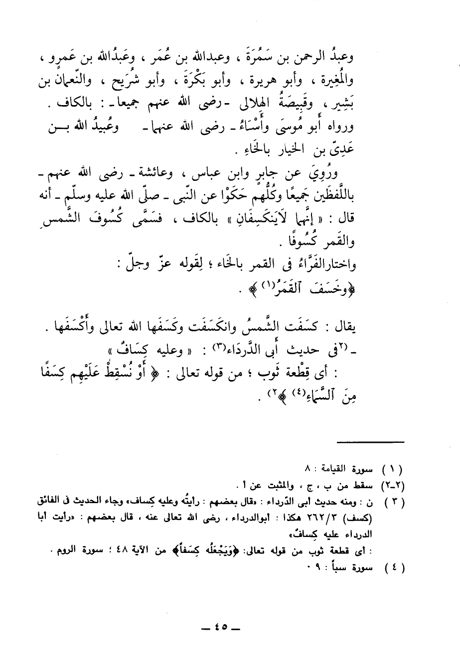 ورُوِيَ عن جابرٍ وابن عباس، وعائشة - رضي الله عنهم - باللَّفظَين جَميعًا وكُلُّهم حَكَوْا عن النّبى - صلّى الله عليه وسلّم - أنه قال: "إنَّهما لَا يَنكَسِفَانِ" بالكاف، فسَمَّى كُسُوفَ الشَّمسِ والقَمر كُسُوفًا.