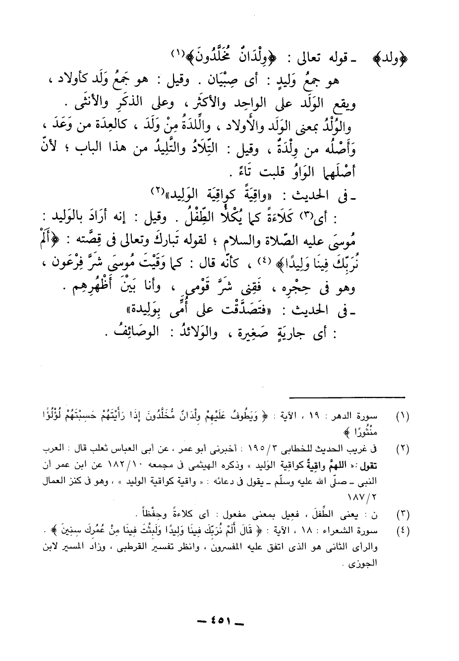 (¬2) في غريب الحديث للخطابى 3/ 195: أخبرنى أبو عمر، عن أبى العباس ثعلب قال. العرب تقول: "اللهمَّ واقِيةً كواقِية الوَليد" وذكره الهيثمى في مجمعه 10/ 182 عن ابن عمر أن النبى - صلّى الله عليه وسلّم - يقول في دعائه: "واقية كواقية الوليد"، وهو في كنز العمال 2/ 187