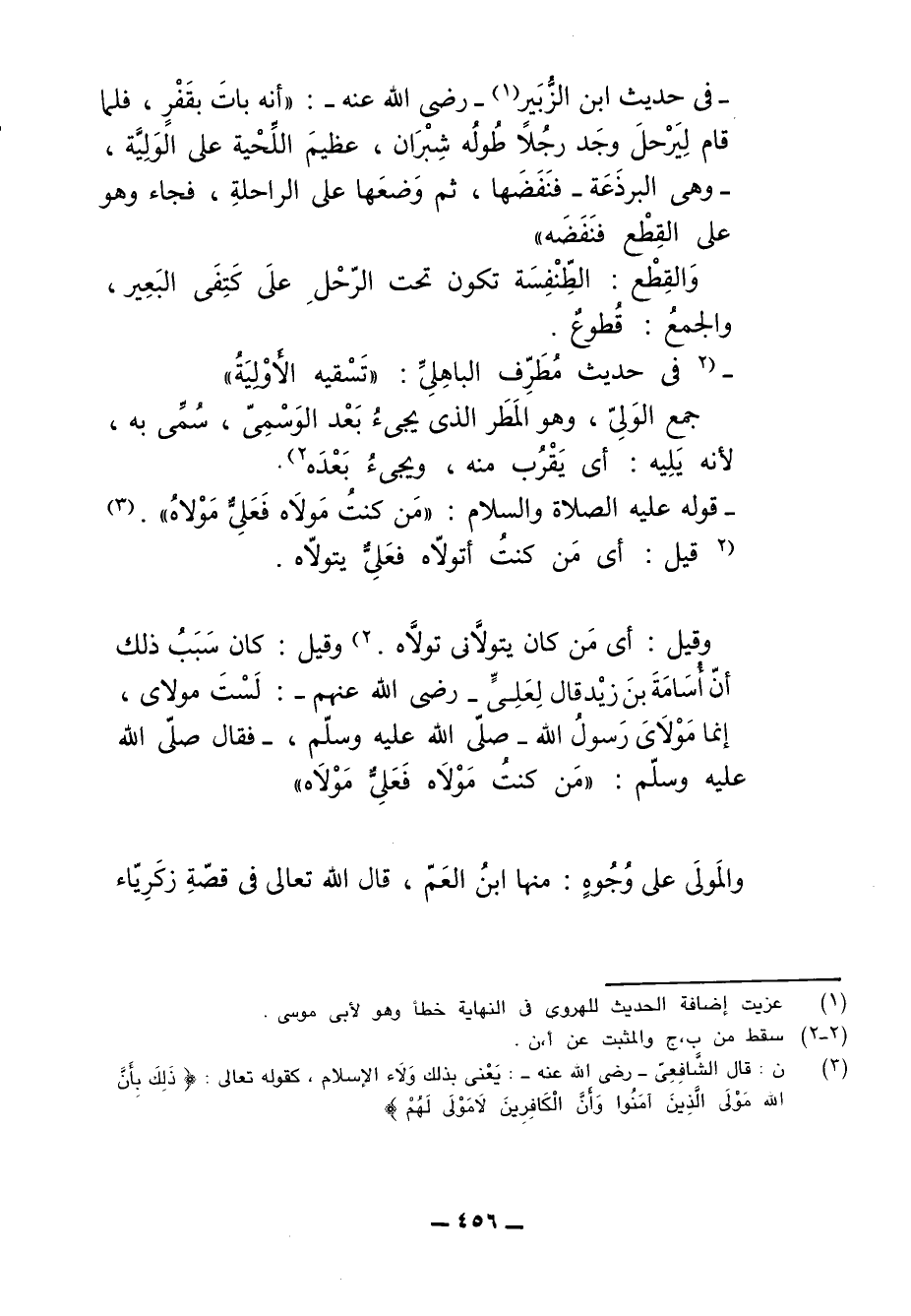 وقيل: أي مَن كان يتولاَّنى تولَّاه. 2) وقيل: كان سَبَبُ ذلك أنّ أُسَامَةَ بنَ زيْد قال لِعَلِىٍّ - رضي الله عنهم -: لَسْتَ مولاى، إنما مَوْلاَىَ رَسولُ الله - صلّى الله عليه وسلّم، - فقال صلّى الله عليه وسلّم: "مَن كنتُ مَوْلَاه فَعَلِىٌّ مَوْلَاه"