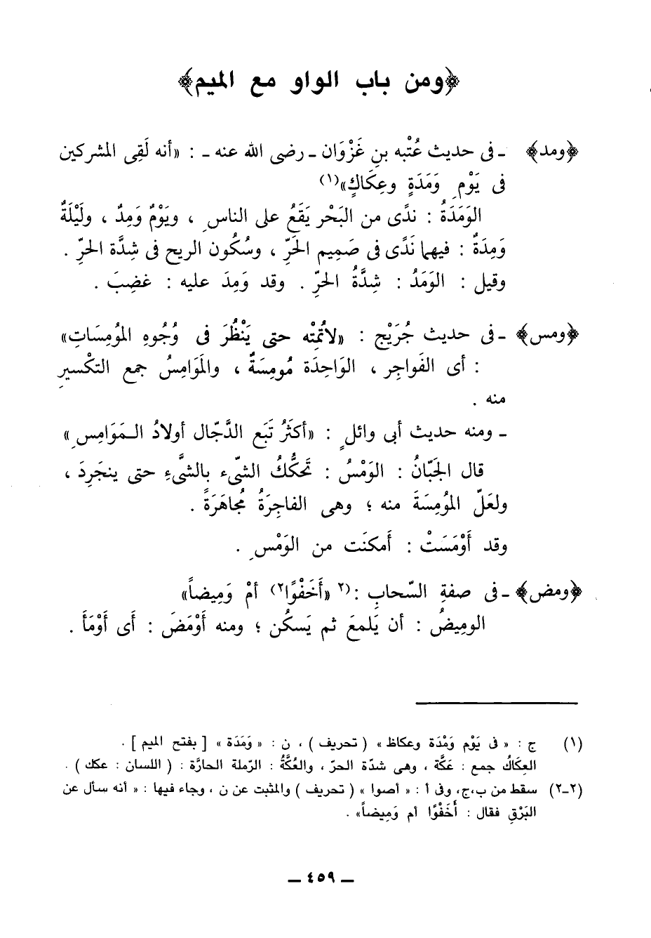 (ومد) - في حديث عُتْبه بنِ غَزْوَان - رضي الله عنه -: "أنه لَقِى المشركين في يَوْم وَمَدَةٍ وعِكَاكٍ" (¬1)