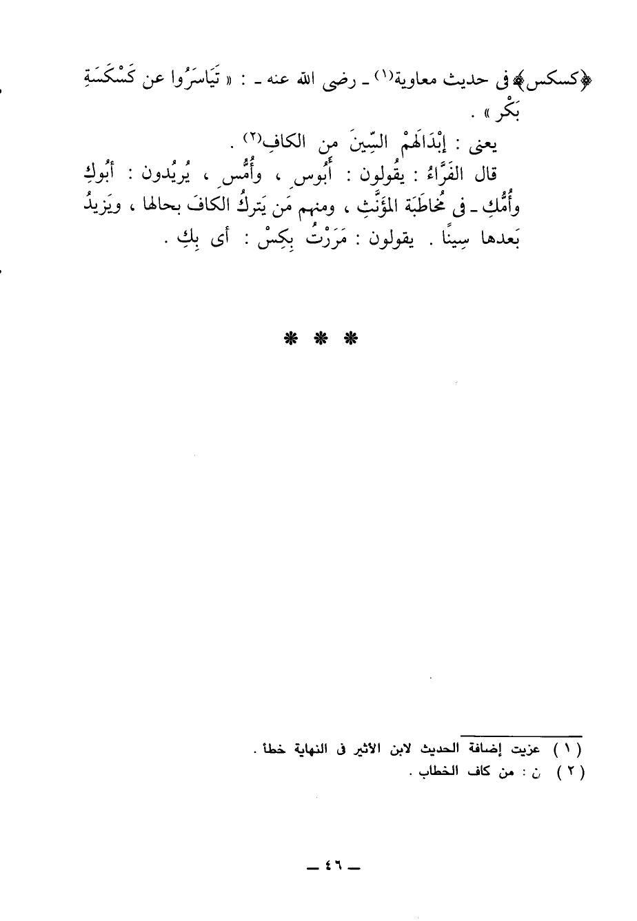 قال الفَرَّاءُ: يقُولون: أَبُوسِ، وأُمُّسِ، يُريُدون: أبُوكِ وأُمُّكِ - في مُخاطَبَة المؤَنَّثِ، ومنهم مَن يَتركُ الكافَ بحالها، وَيزيدُ بَعدها سِينًا. يقولون: مَرَرْتُ بِكِسْ: أي بِكِ.