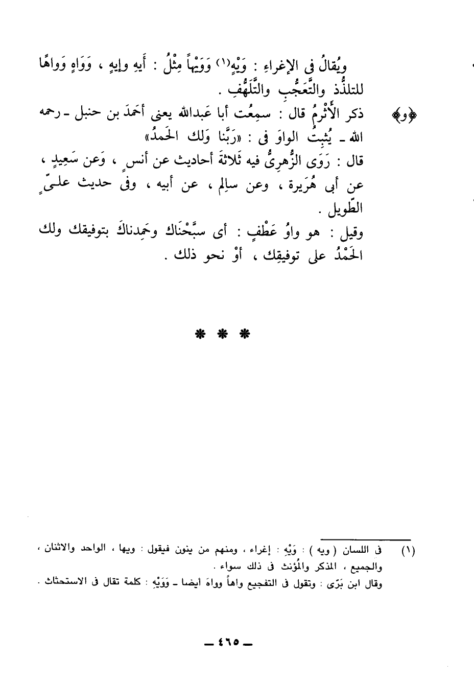ويُقالُ في الإغراءِ: وَيْهٍ (¬1) وَوَيْهاً مِثْلُ: أَيهِ وإيهٍ، وَوَاهٍ وَواهًا للتلذُّذ والتَّعَجُّب والتَّلَهُّفِ.
