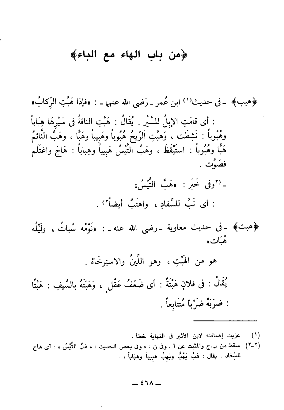 (2 - 2) سقط من ب، جـ والمثبت عن أ. وفي ن: "وفي بعض الحديث: "هَبَّ التَّيْسُ": أي هاج للسِّفاد. يقال: هَبَّ يَهُبُّ ويَهِبُّ هبِيباً وهِبَاباً".