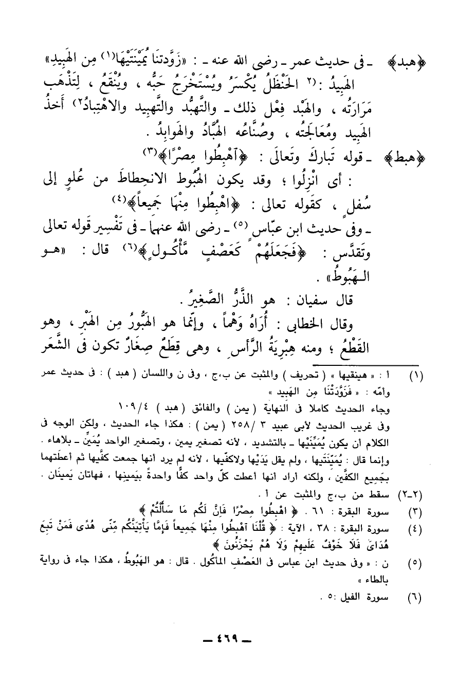 (¬5) ن: "وفي حديث ابن عباس في العَصْفِ المأكُول. قال: هو الهَبُوطُ، هكذا جاء في رواية بالطاء"