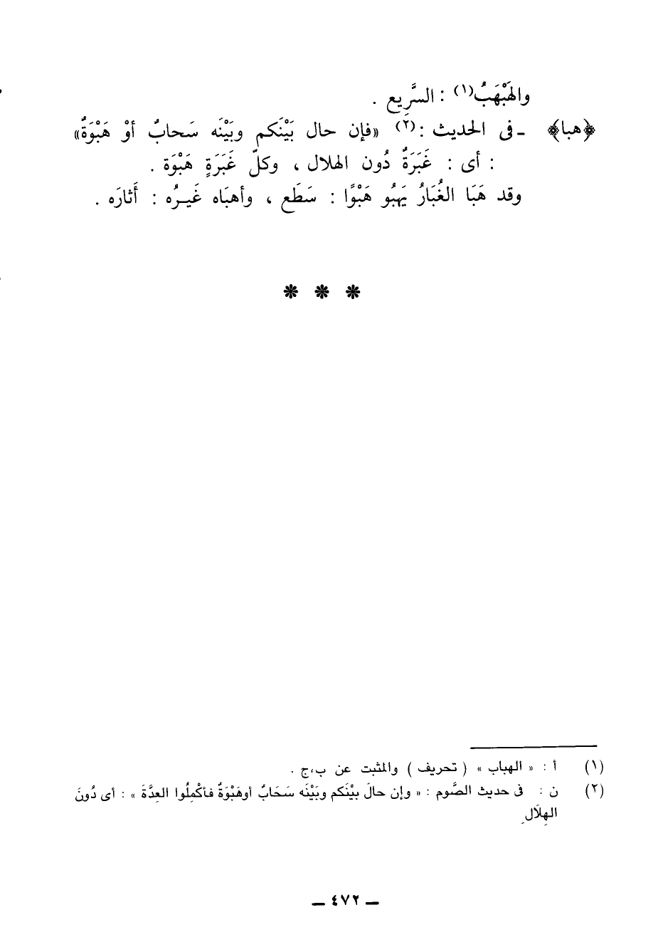 (¬2) ن: في حديث الصَّوم: "وإن حالَ بيْنَكم وبَيْنَه سَحَابٌ أو هَبْوَةٌ فأكْمِلُوا العِدَّة": أي دُونَ الهِلاَلِ
